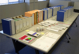 この机いっぱいに並んだ書類、実はたった一つの農薬を登録するのに必要な試験の結果なんです。一つの農薬だけでこんなにたくさん試験します。