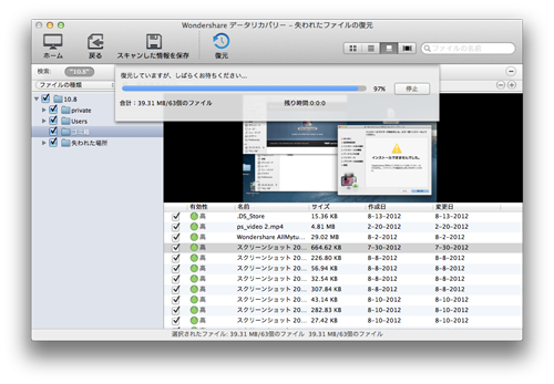 復元したいファイルにチェックを入れたら、あとは[復元]をクリックするだけです。 ドキュメントはもちろん、音楽や画像、動画などあらゆるデータを簡単な操作で復元することができます。