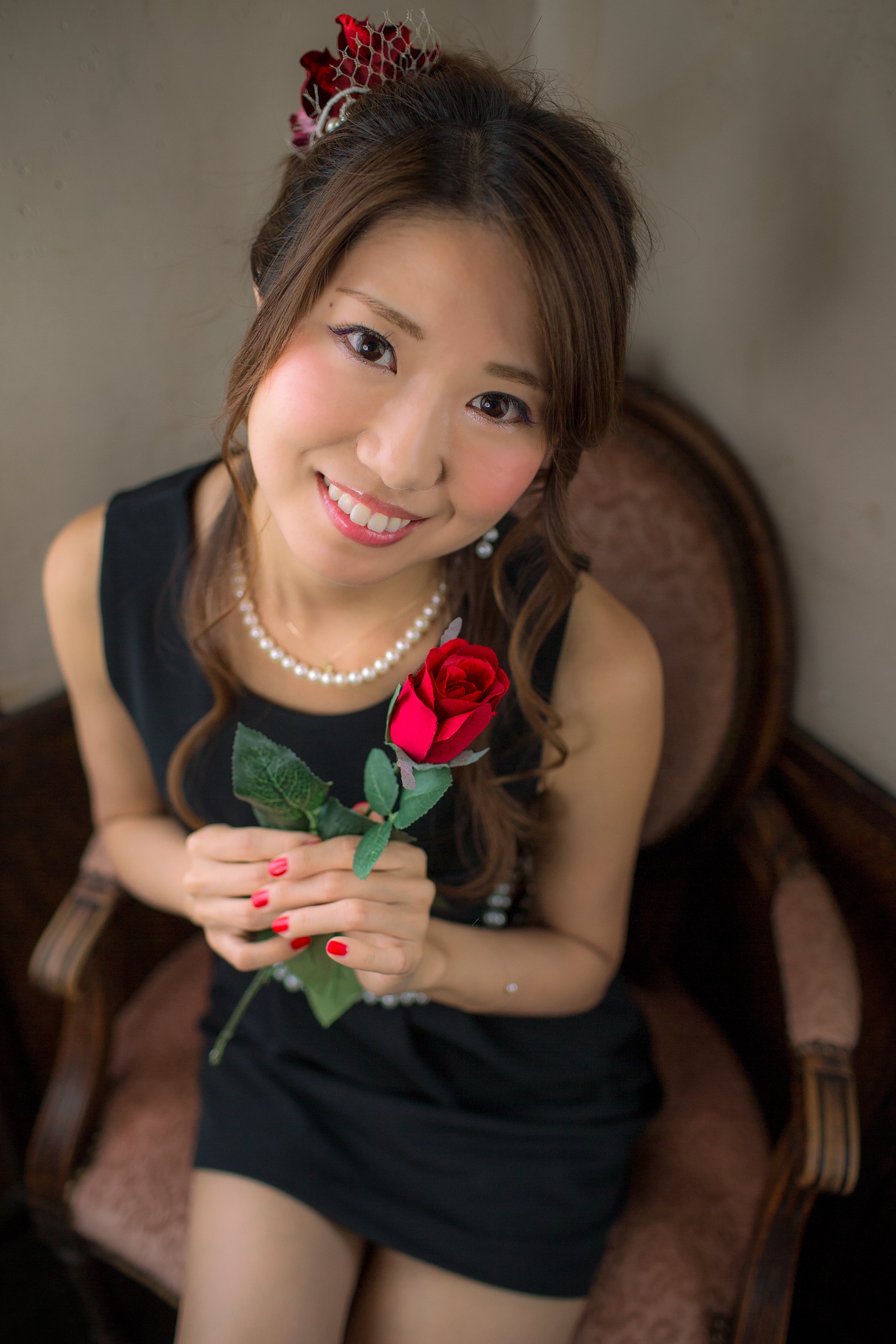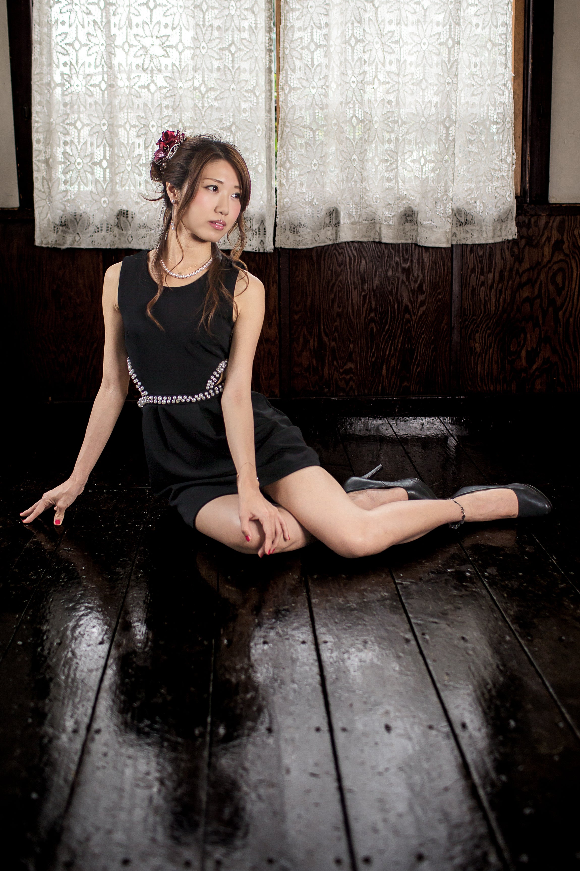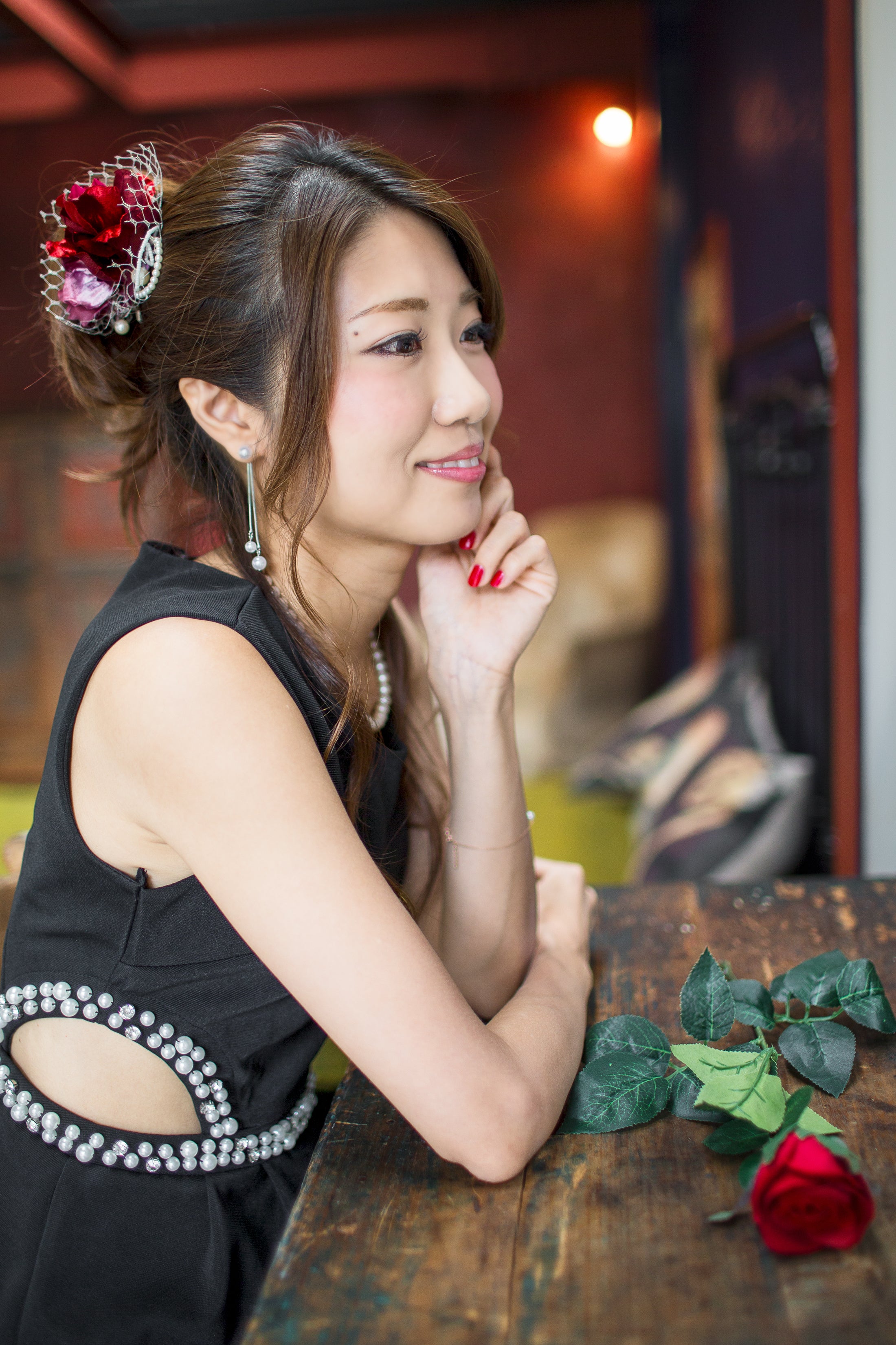 黒い床と花びらの赤のコントラストがお気に入りの1枚。RENAKOさんのキラキラ光る瞳も素敵。