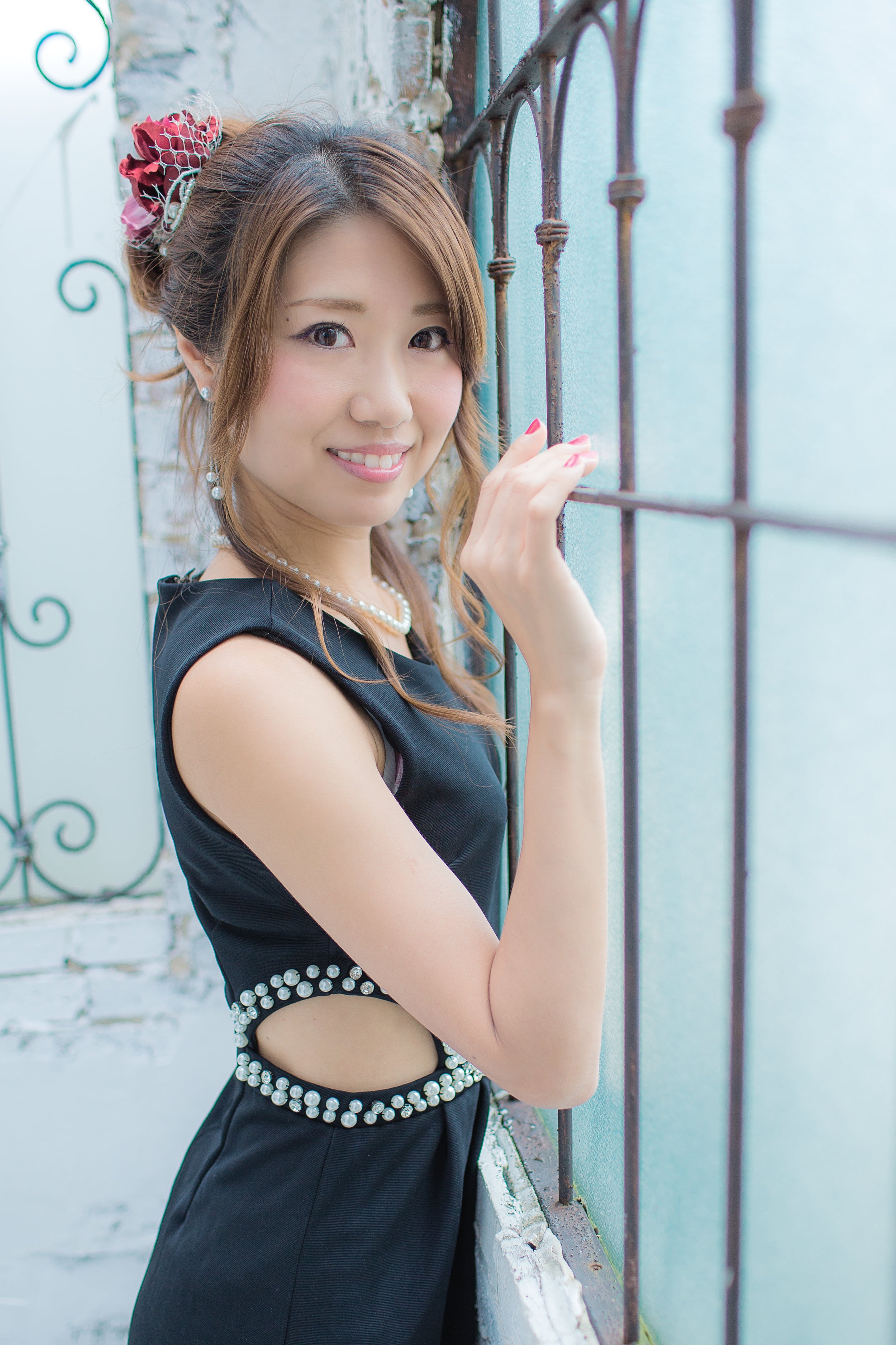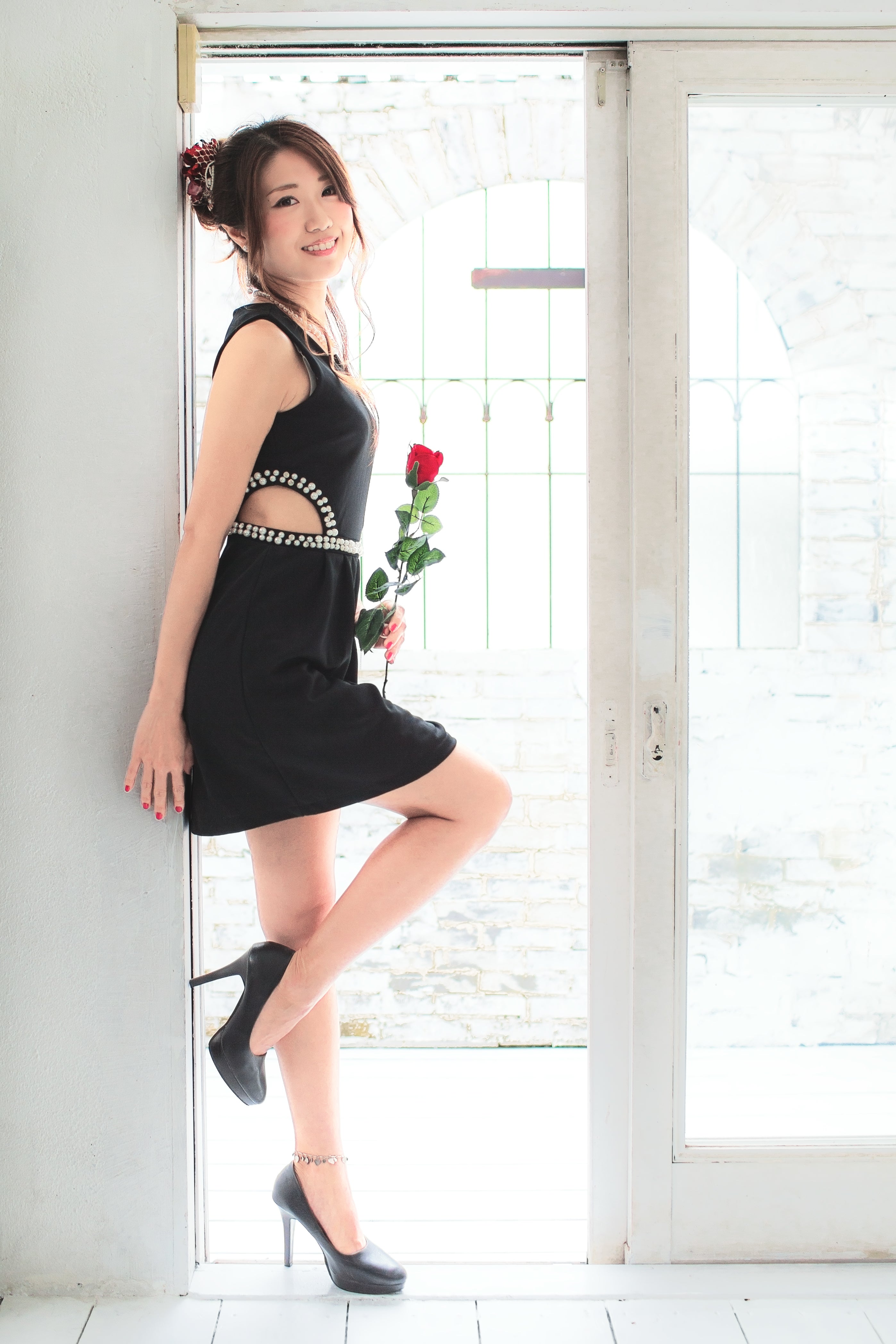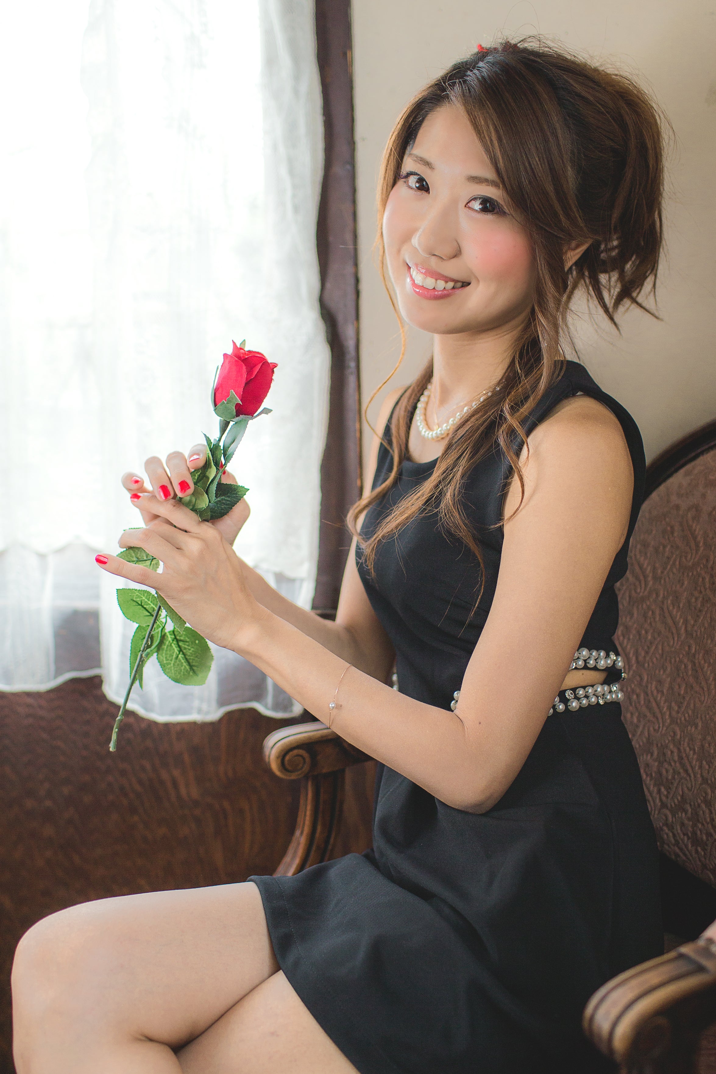 黒い床と花びらの赤のコントラストがお気に入りの1枚。RENAKOさんのキラキラ光る瞳も素敵。