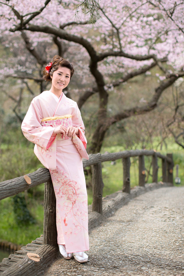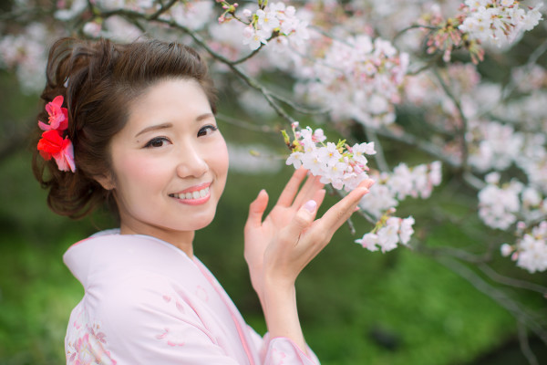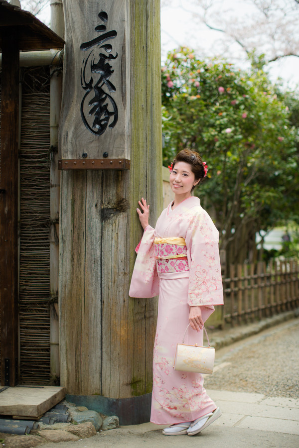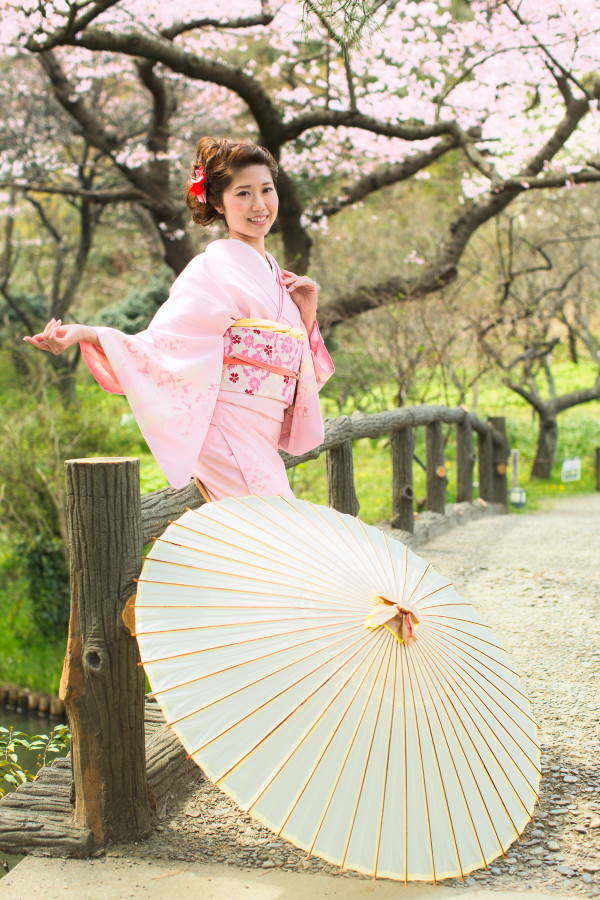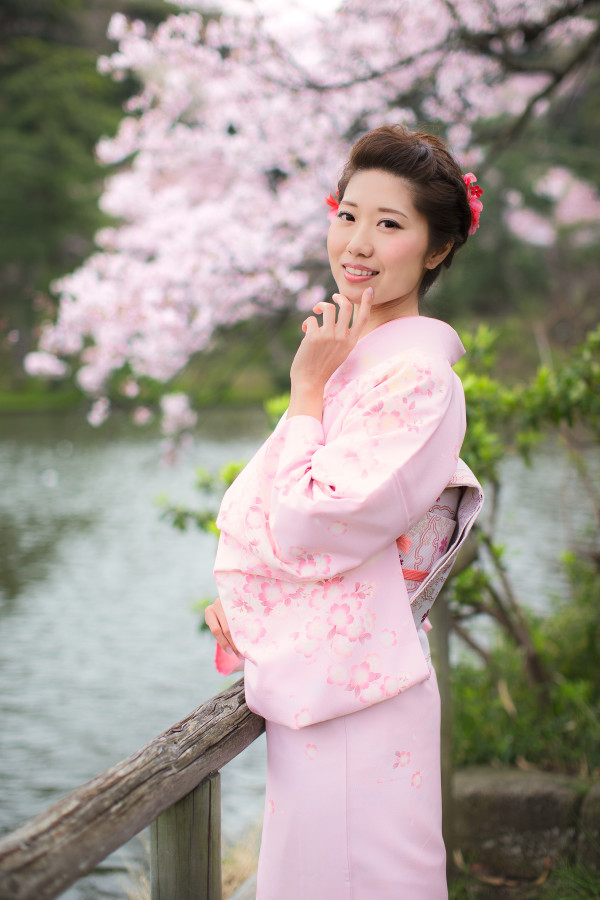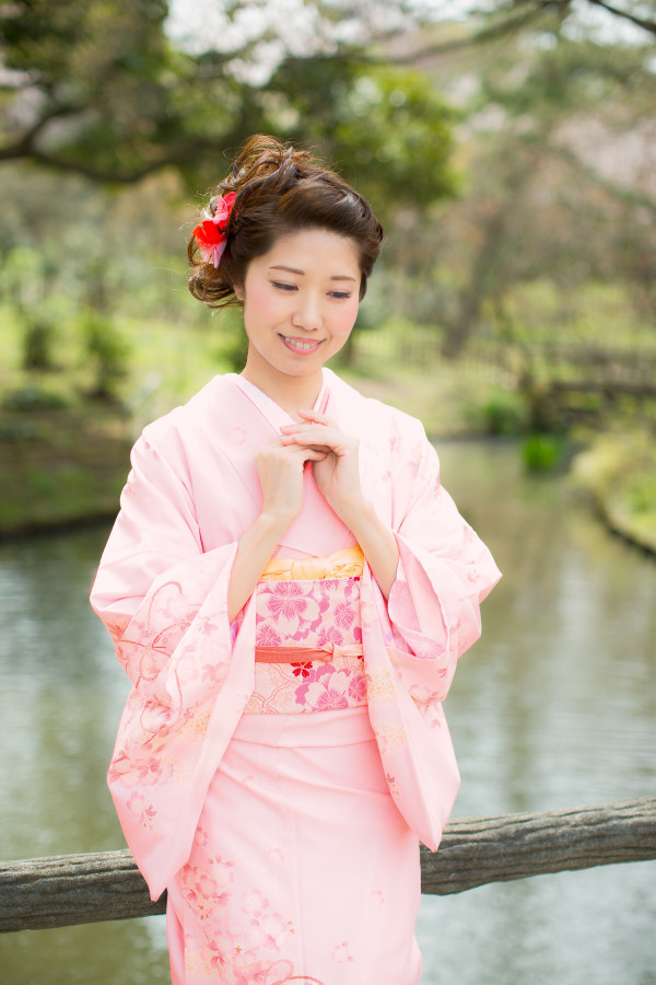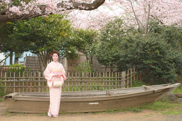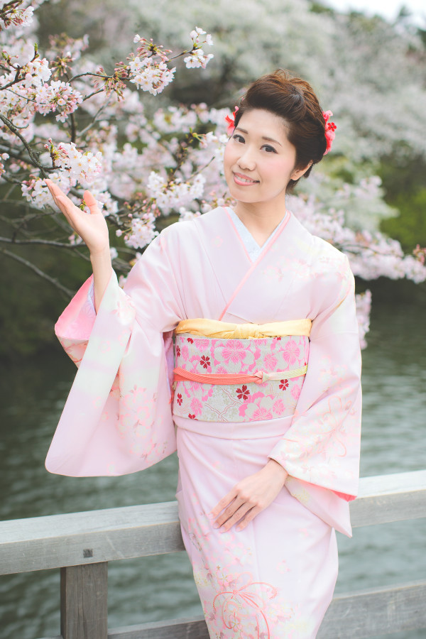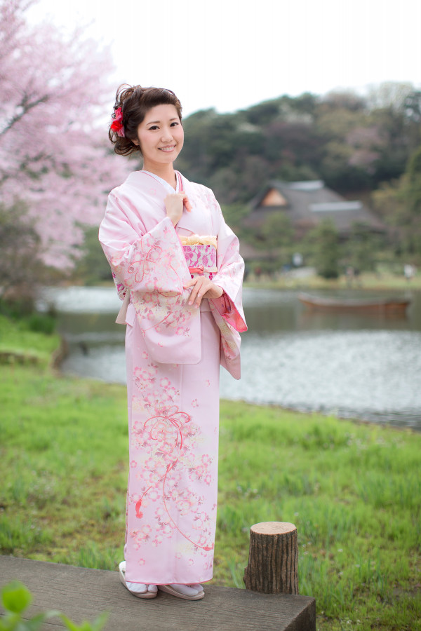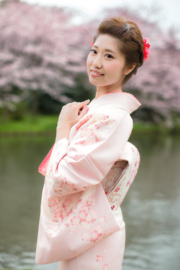 RENAKOさんのお召しになっている着物も桜と同じピンク色、柄も桜の柄でお花見撮影にピッタリ