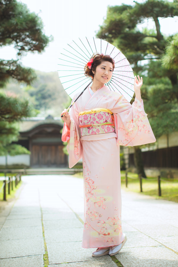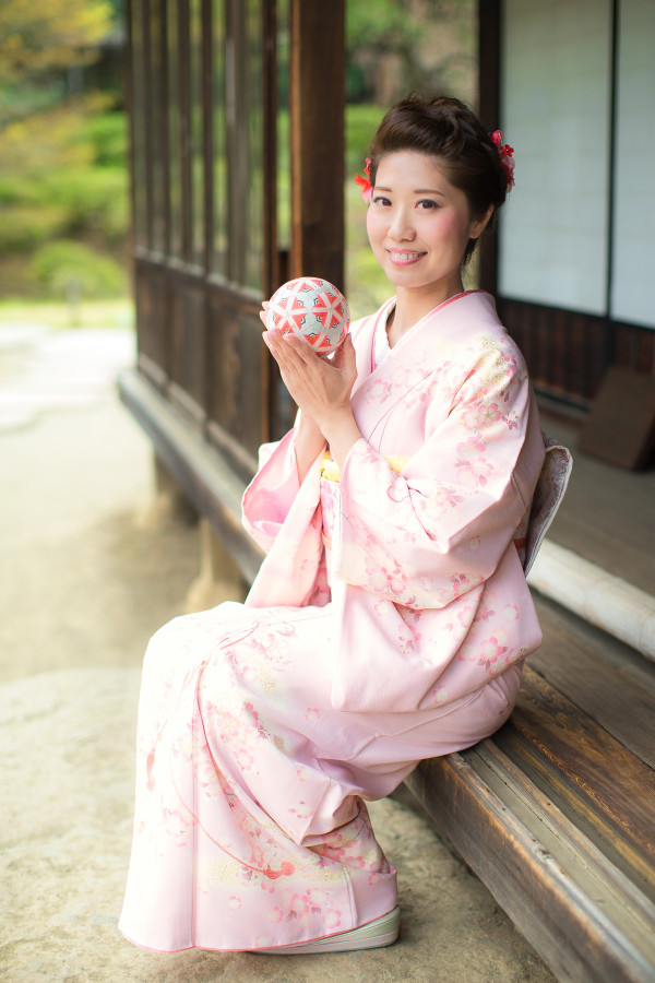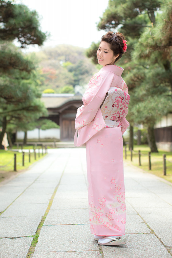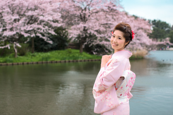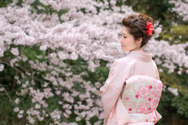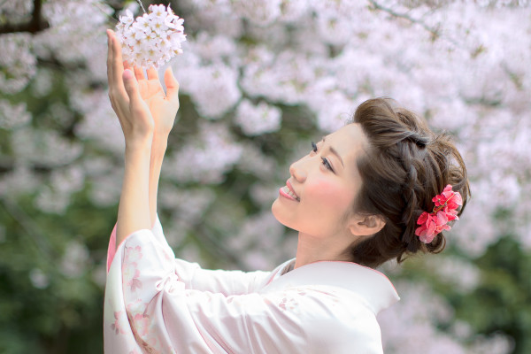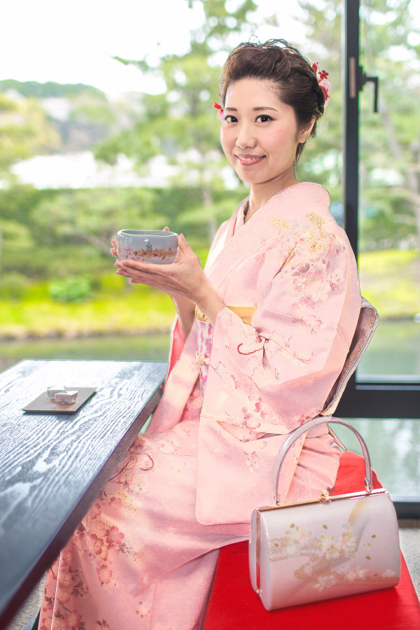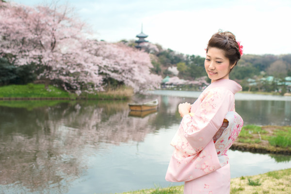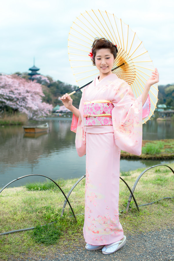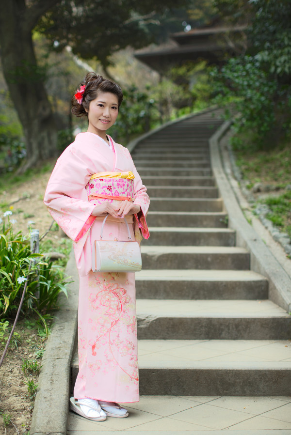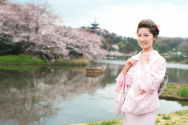 RENAKOさんのお召しになっている着物も桜と同じピンク色、柄も桜の柄でお花見撮影にピッタリ