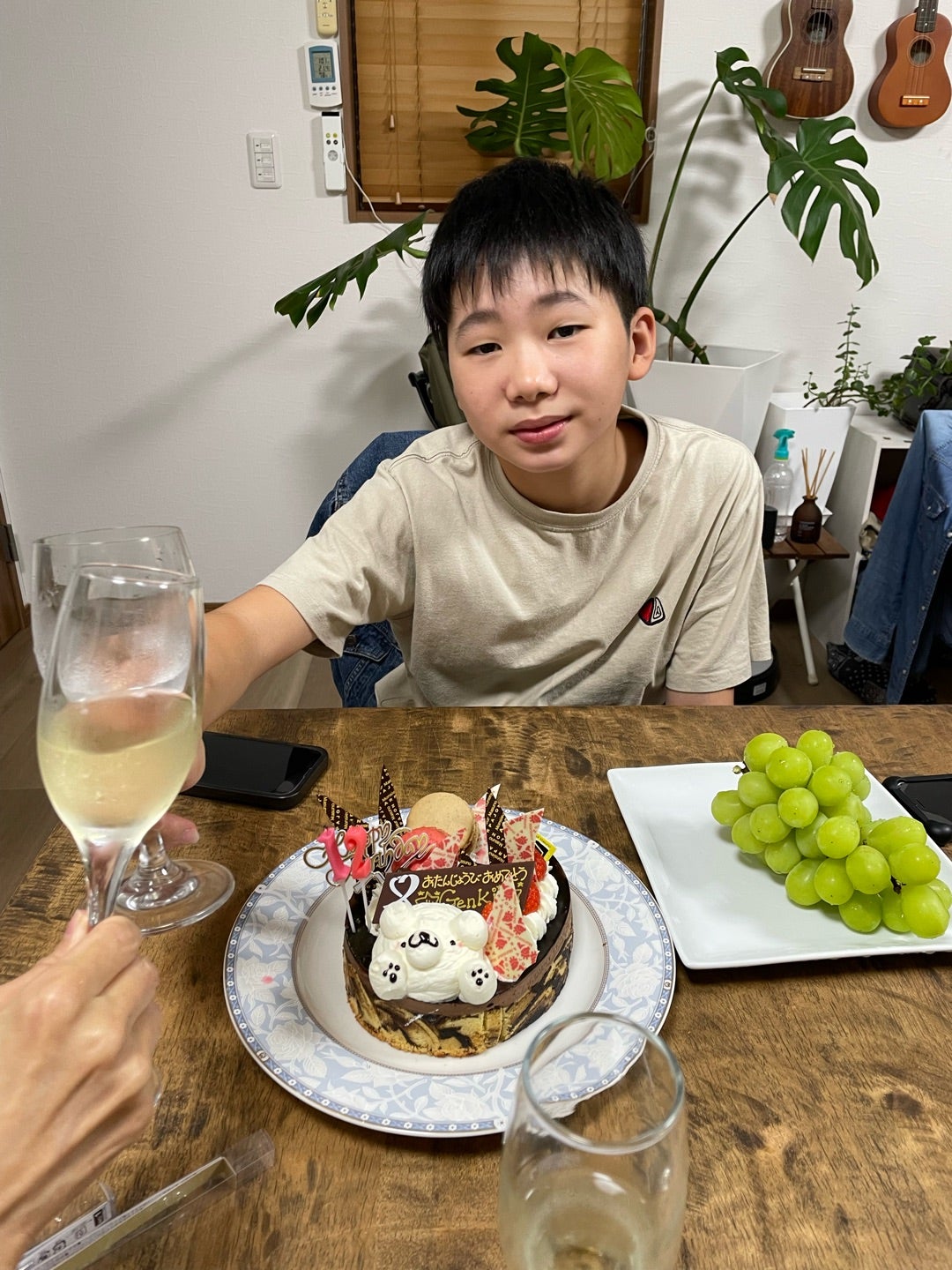 12歳の誕生日ようやく12歳誕生日は天気が悪くてどこへも行けなかったのでアルパジョンのケーキでお祝いケーキと言いながら、ほぼチョコレートムースですな。ふるさと納税で頼んだ山梨県のシャインマスカットもちょうど届いてワインで乾杯!あ、元輝はシャンメリね。