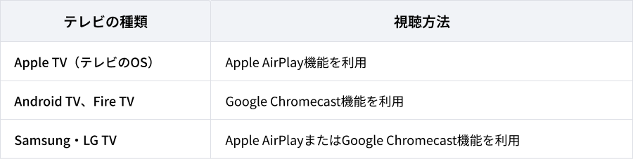 Apple AirPlayまたはGoogle Chromecastに対応するスマートフォン及びテレビでご利用いただけます。また、お使いのテレビが対応しているかどうかは、各メーカーへご確認 ください。