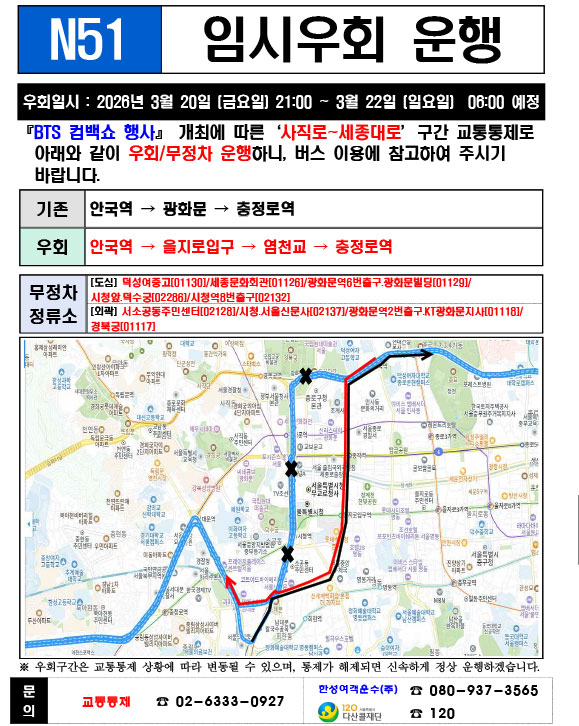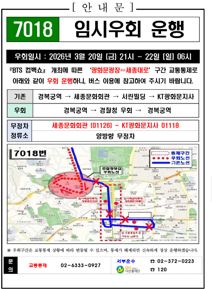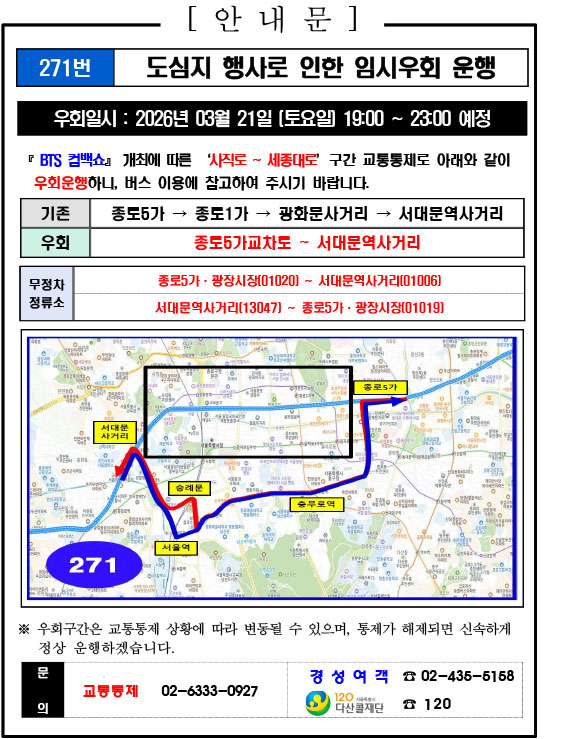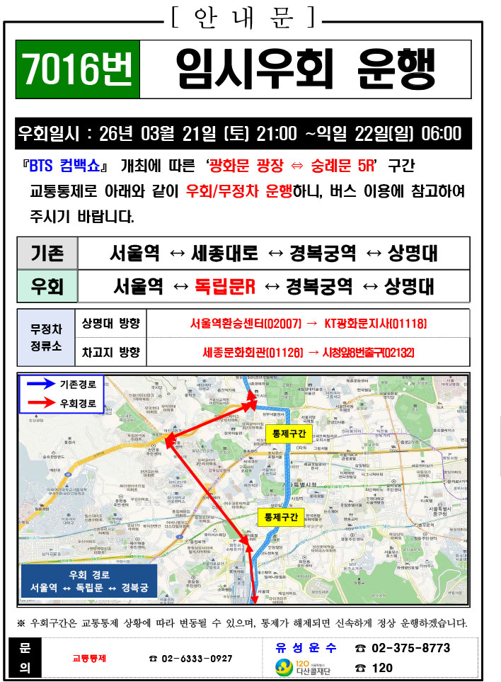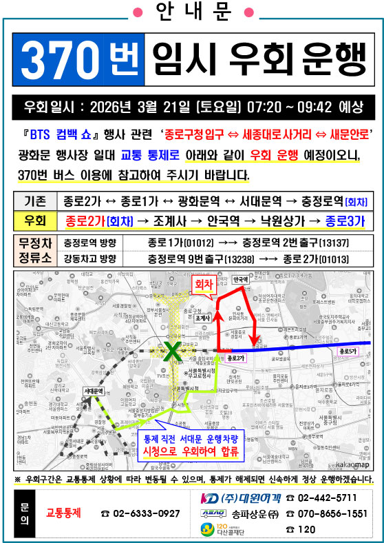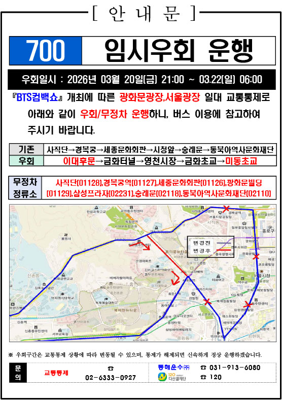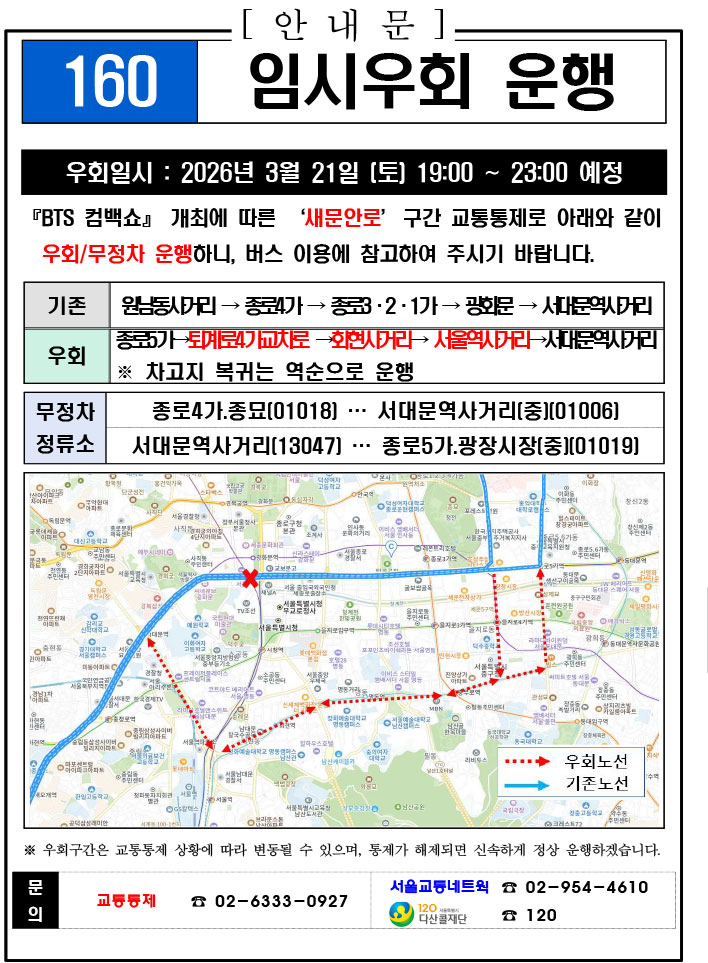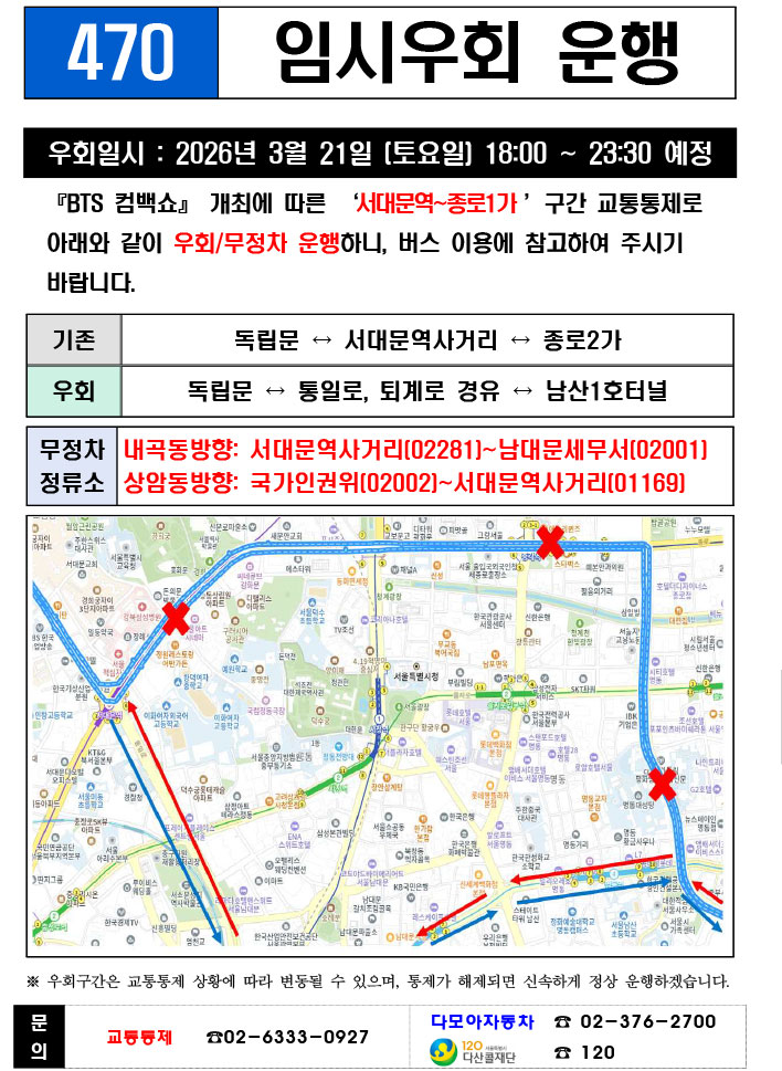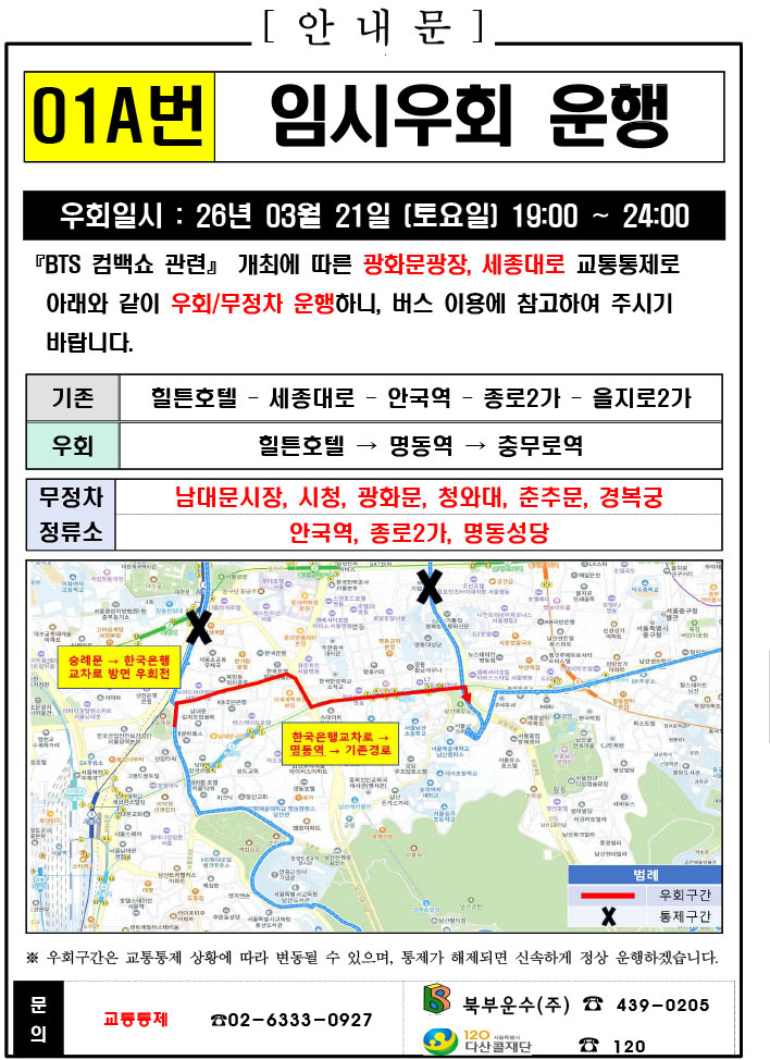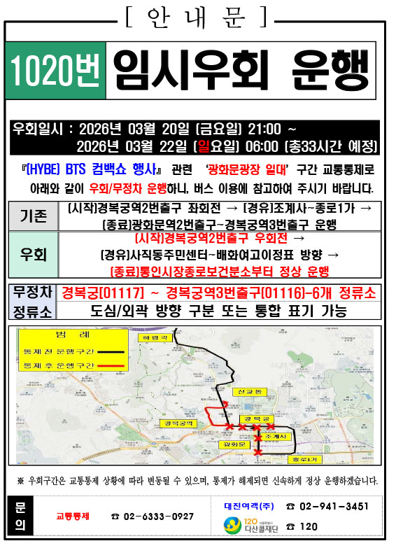 - 警察の群衆管理計画(スタジアムタイプ)に沿った3.21.(土)光化門駅 中央江バスレーン停留所(ID 01009, 01010) 停車なしで通過してください