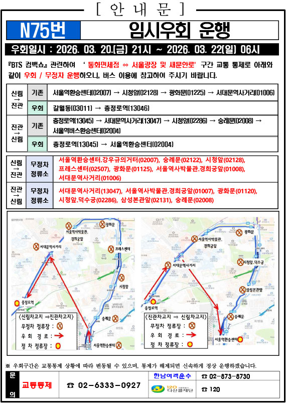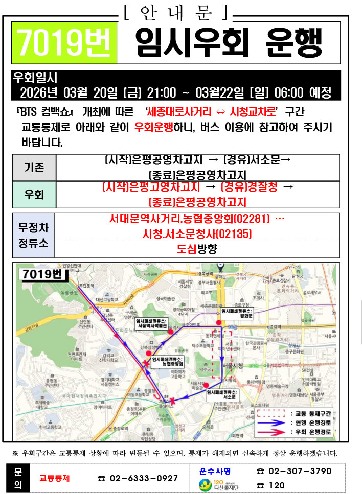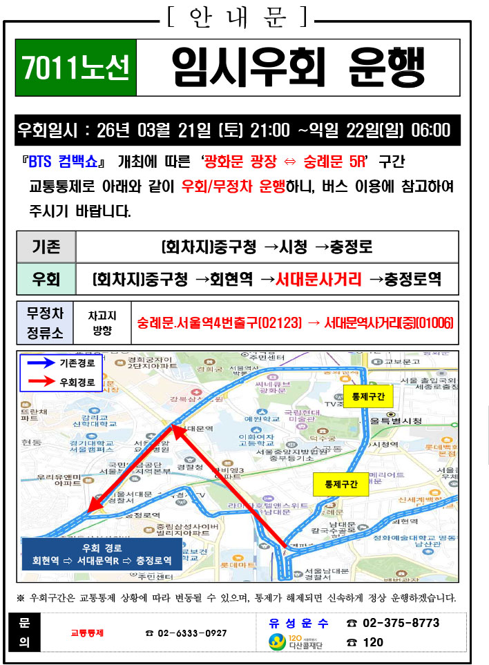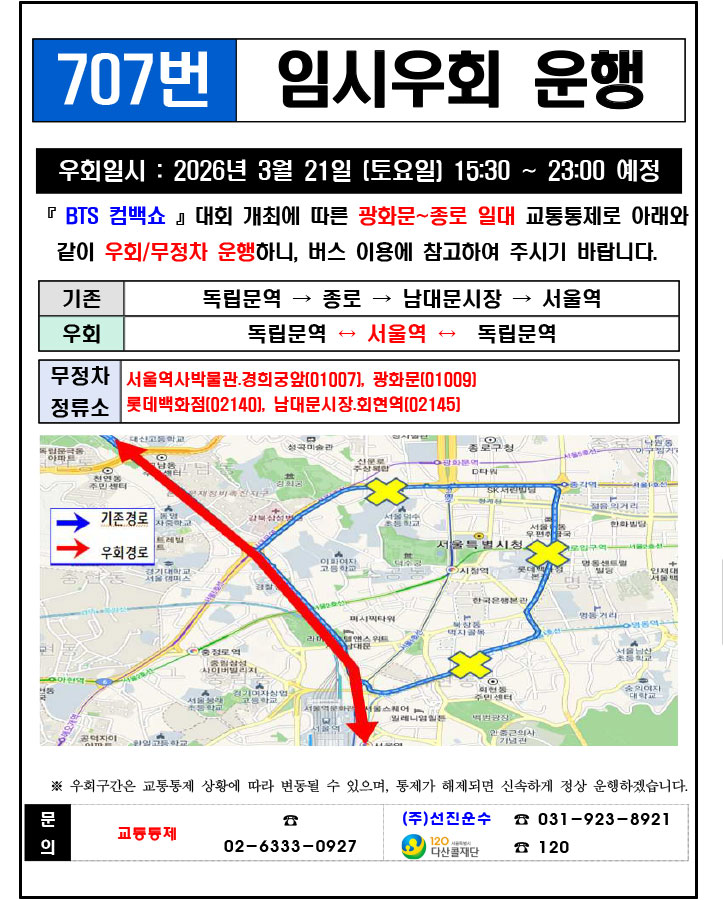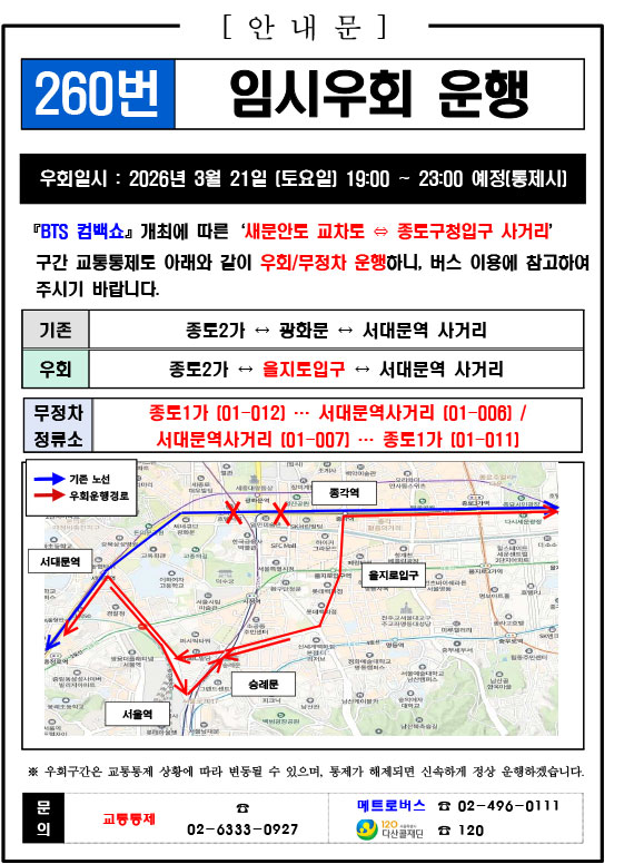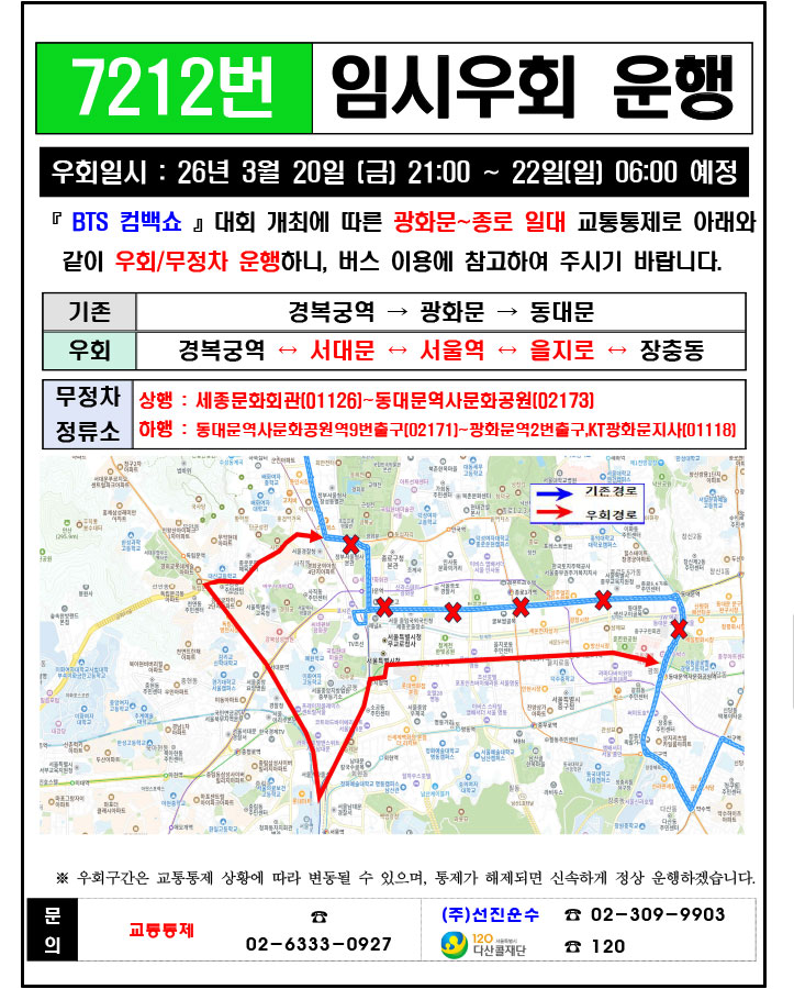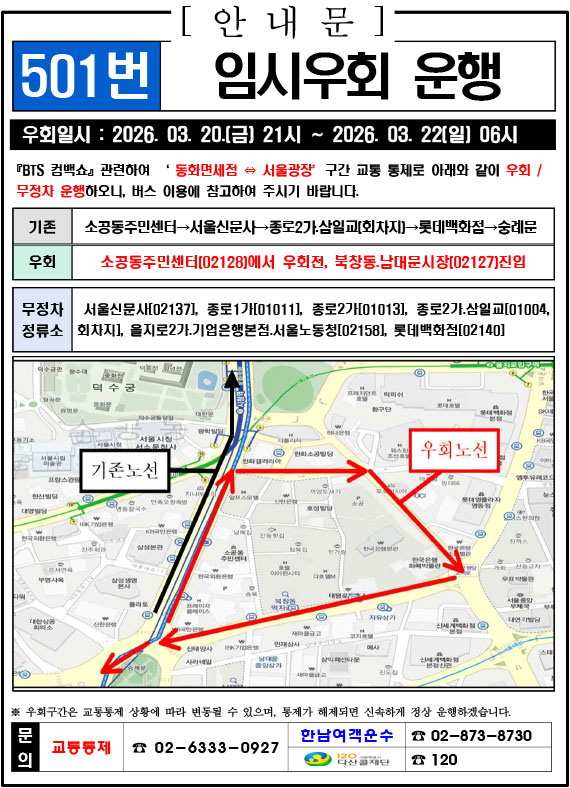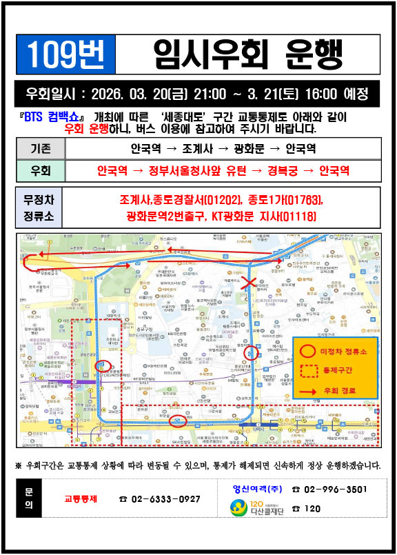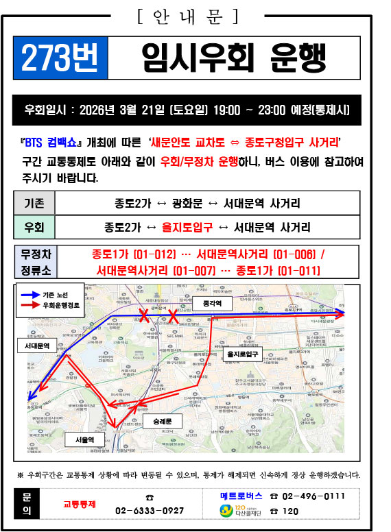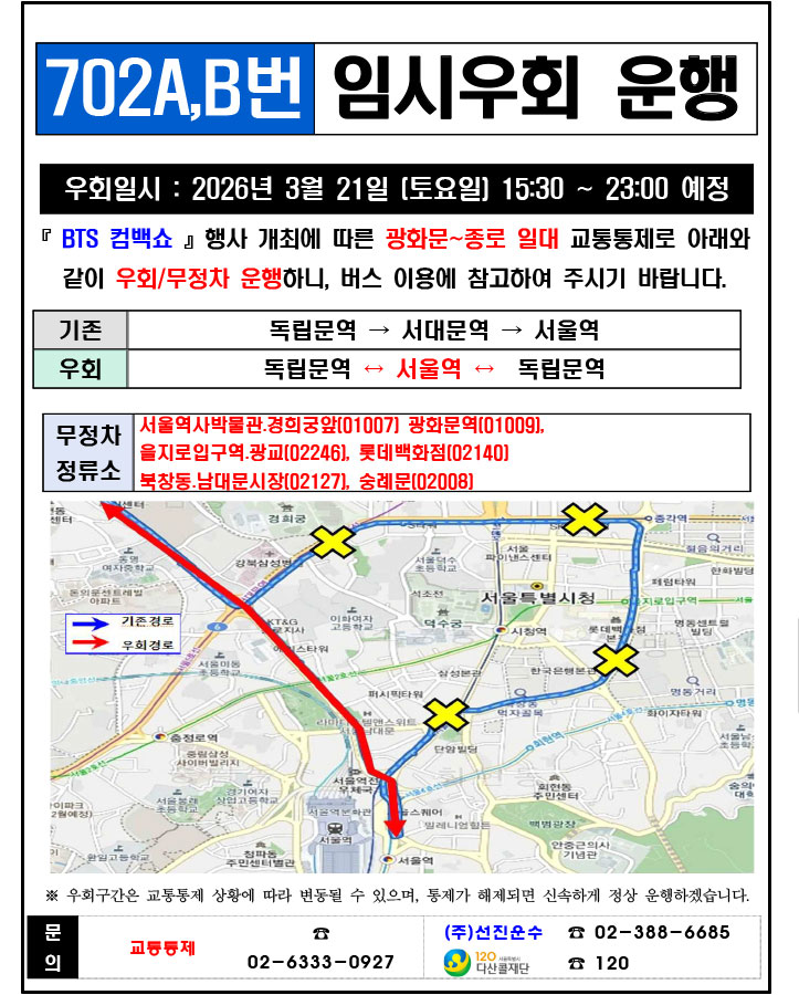 - 警察の群衆管理計画(スタジアムタイプ)に沿った3.21.(土)光化門駅 中央江バスレーン停留所(ID 01009, 01010) 停車なしで通過してください