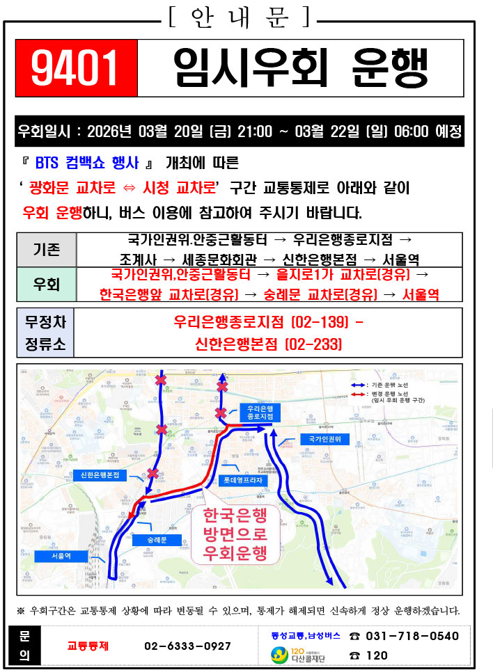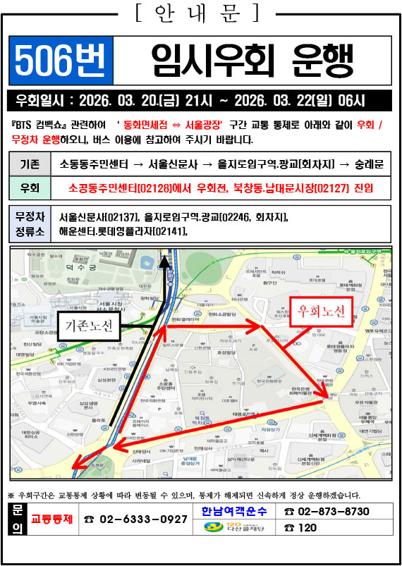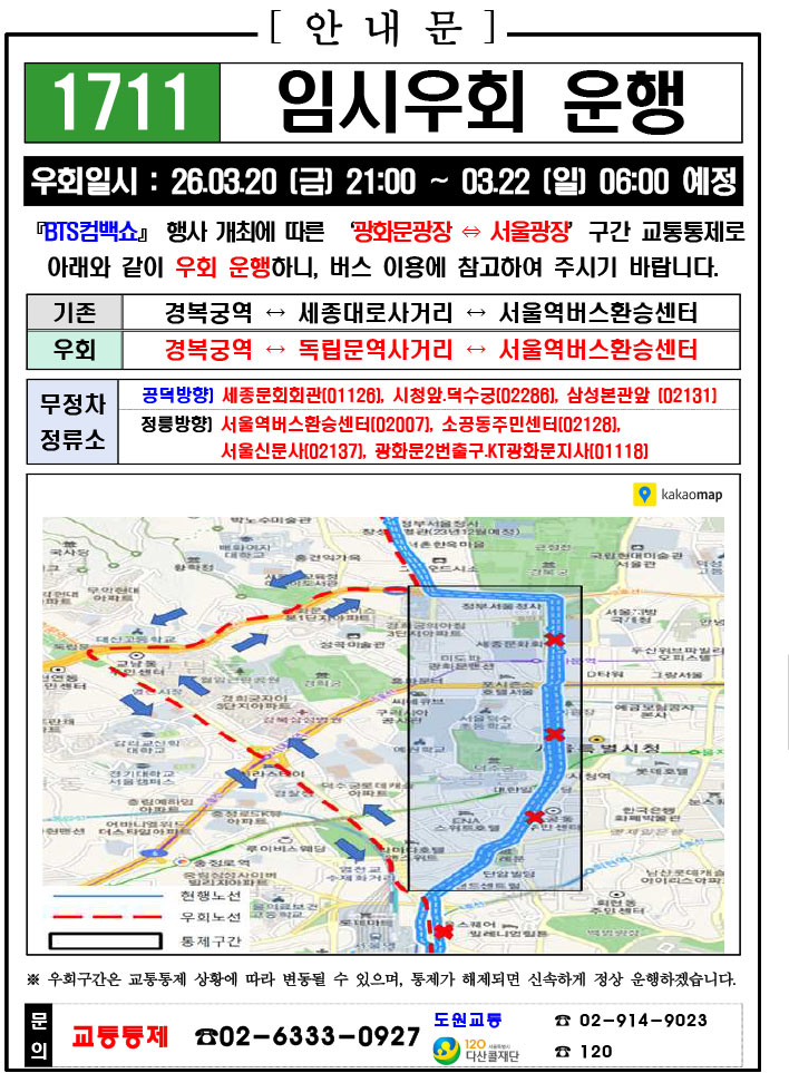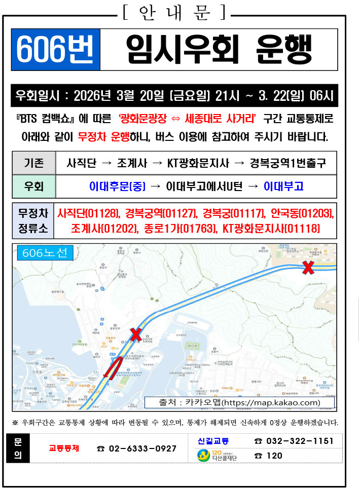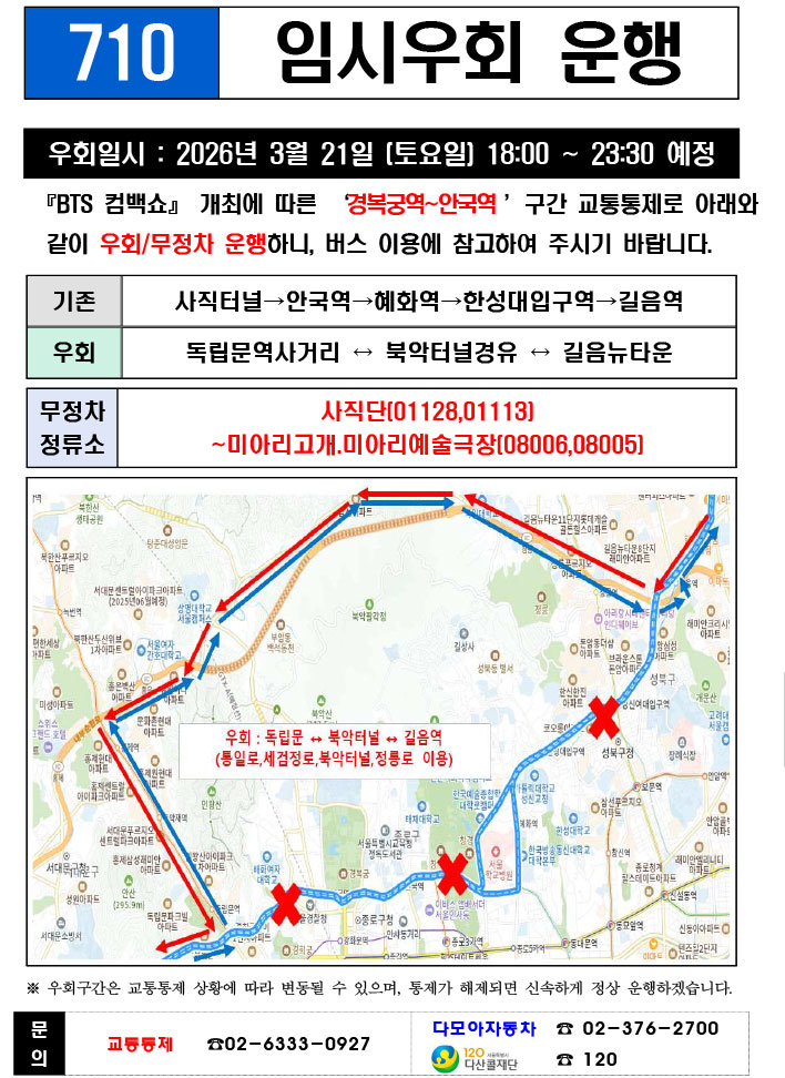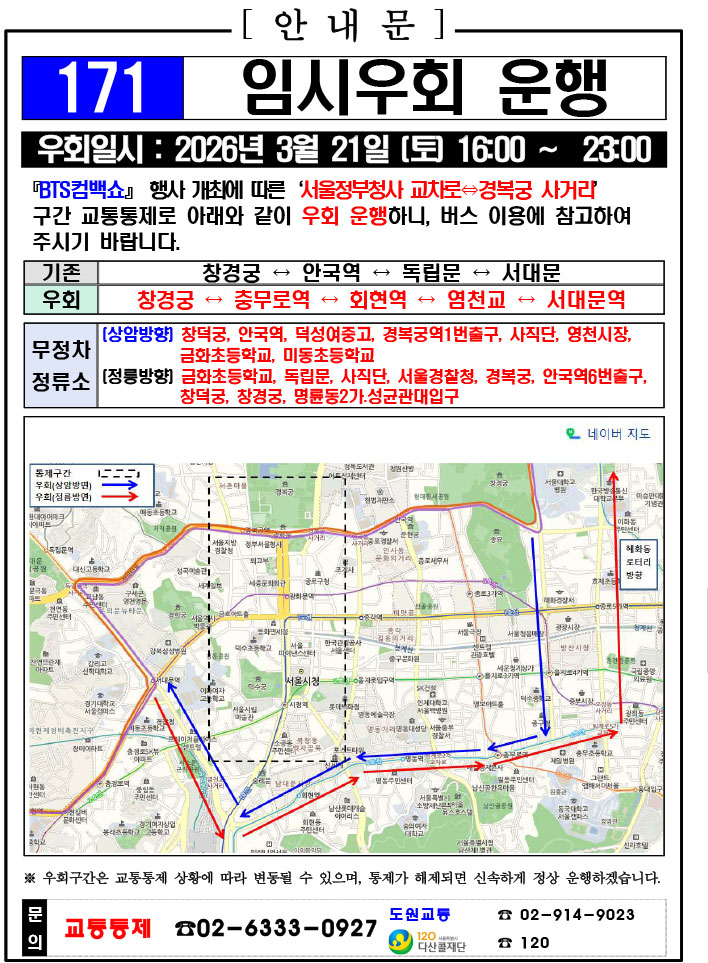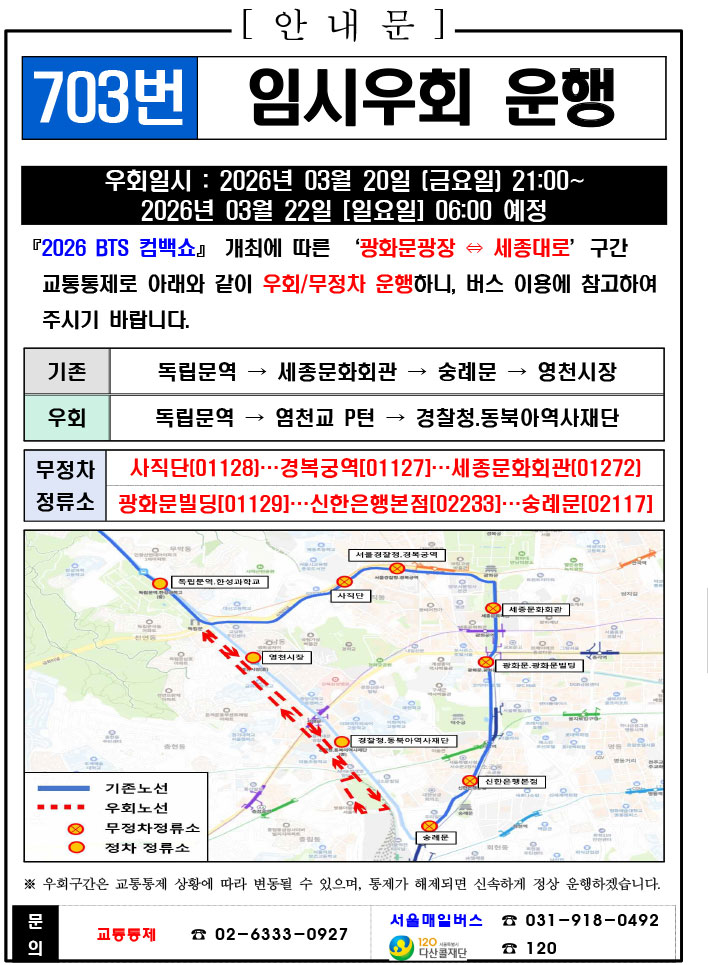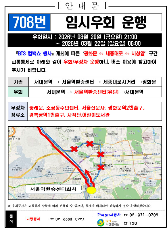 - 警察の群衆管理計画(スタジアムタイプ)に沿った3.21.(土)光化門駅 中央江バスレーン停留所(ID 01009, 01010) 停車なしで通過してください