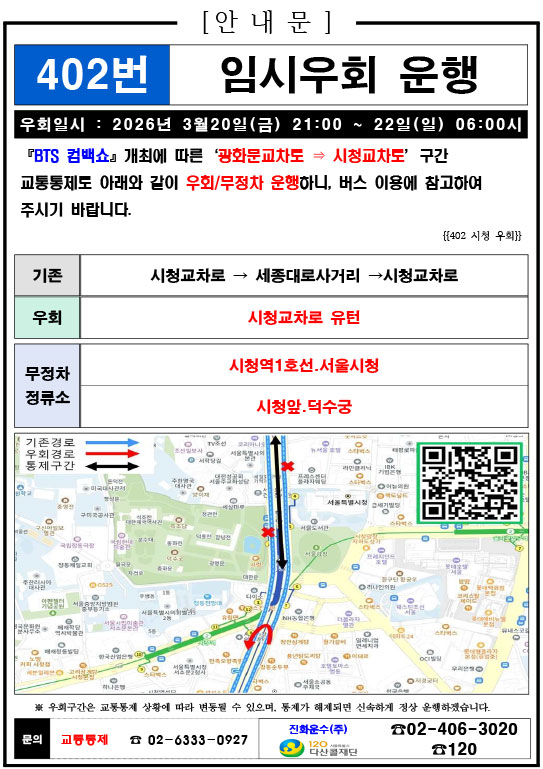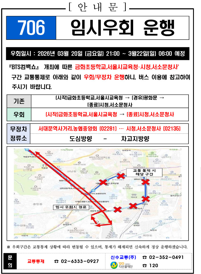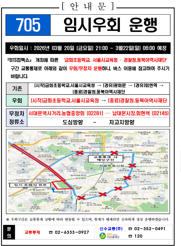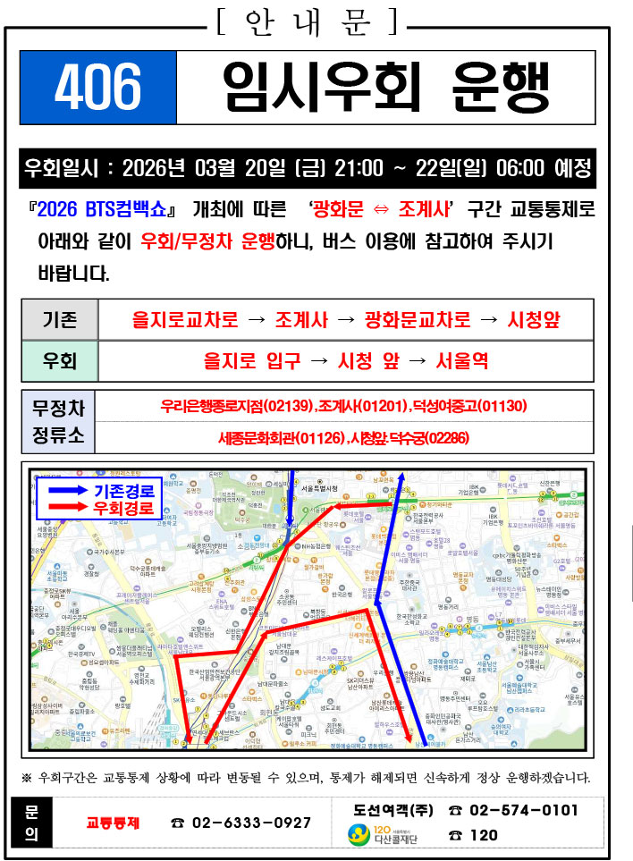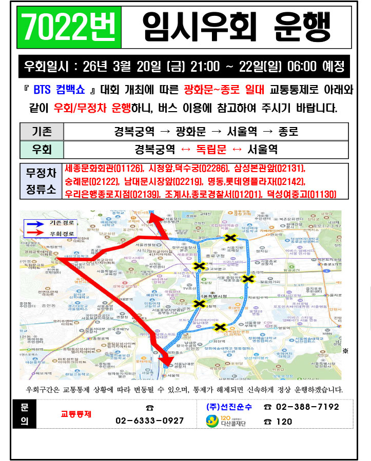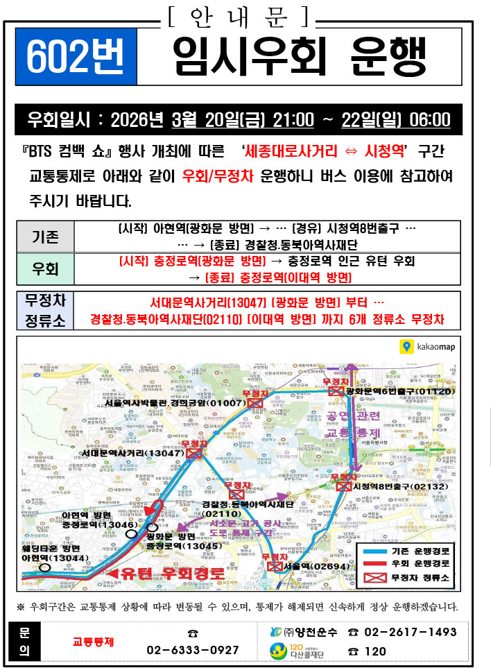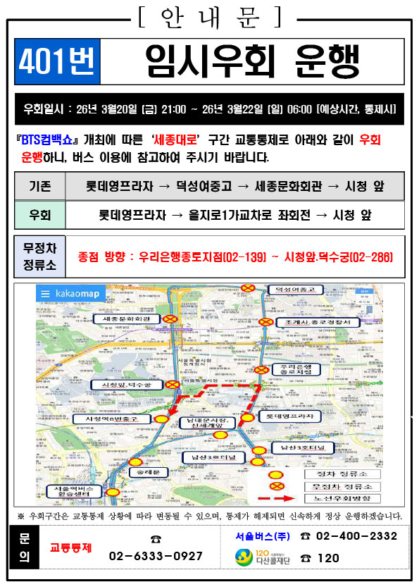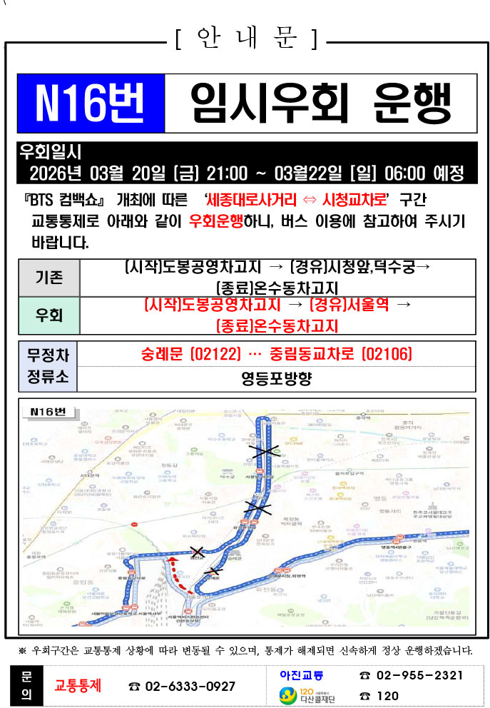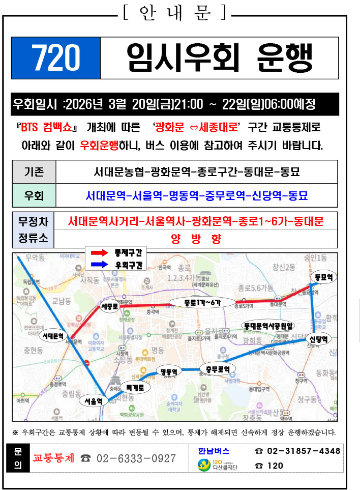 - 警察の群衆管理計画(スタジアムタイプ)に沿った3.21.(土)光化門駅 中央江バスレーン停留所(ID 01009, 01010) 停車なしで通過してください