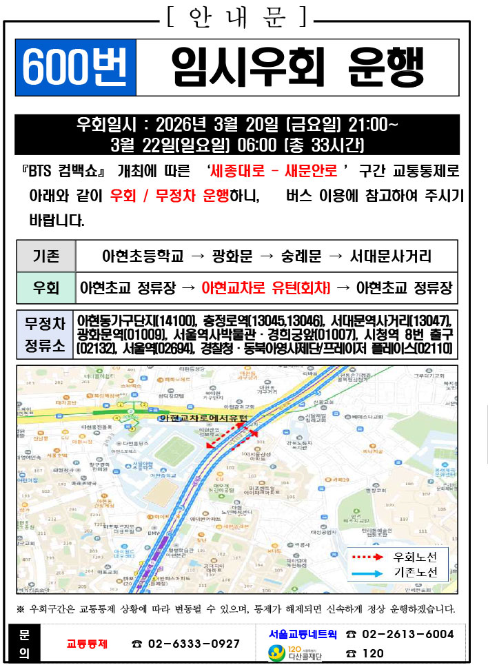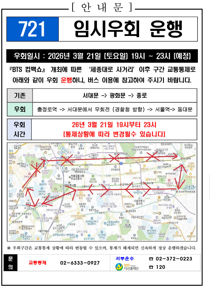 - 光化門地下道(道城R~イマR)- 3月21日(土)19:00 ~ 3月21日(土)23:00(4時間)、管制理由:聴衆の安全確保、特別事項:(徐>洞と東の一方通行維持)