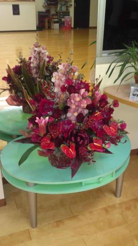 そして、大親友のまっちーさんに 還暦のイメージの紅のお花でということと、予算だけお伝えしたら、こんな素晴らしい花籠が着ました~~~
