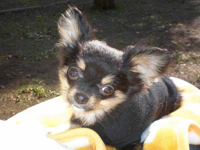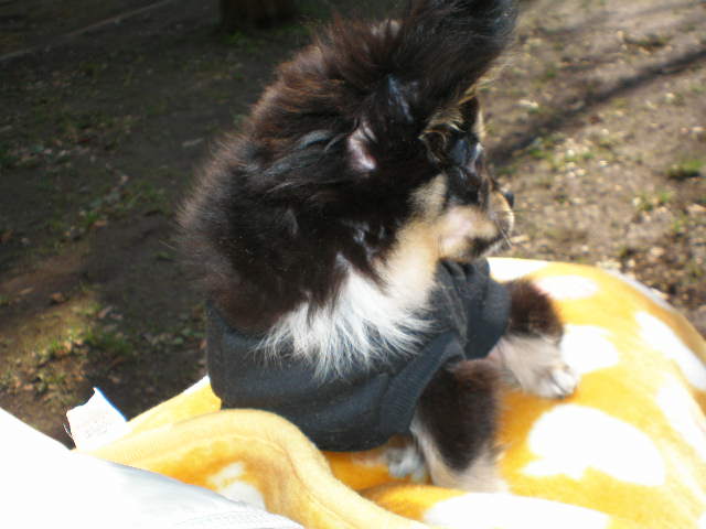 今日も家では大騒ぎして首輪も付けれないほどだったのに、外に出た途端、私にしがみつきしばらくは顔も上げないほど(^^;)でも、少しすると周りの様子を見る余裕も出てきてキョロキョロしはじめる。でも、公園でベンチに座り膝の上に降ろすと途端にブルブルと震えだす。。。