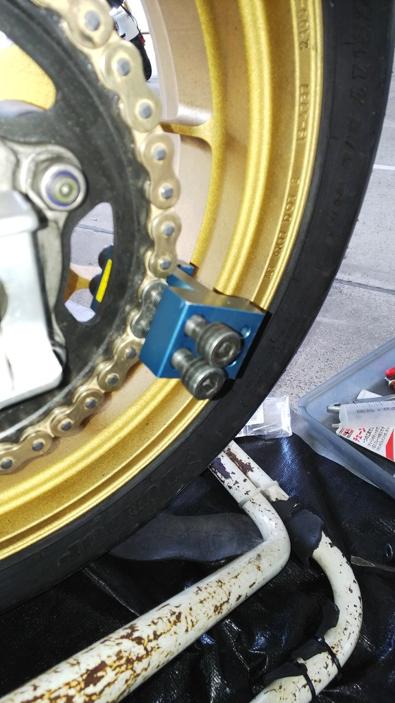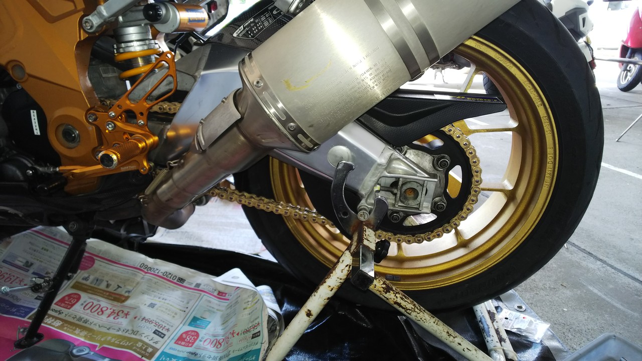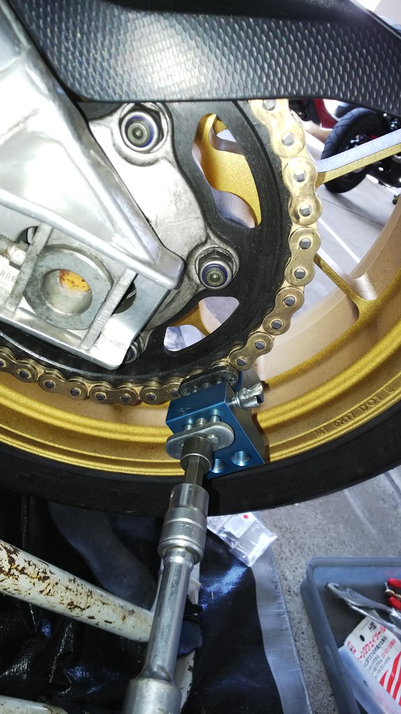 リアホイールアクスルを調整してチェーンを規定の張りまで引っ張ります。真ん中部分で上下幅が25mmになる様に調整します。