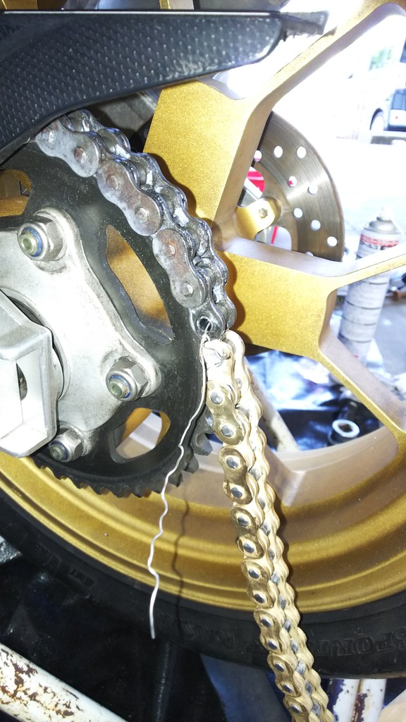 古いチェーンに新しいチェーンを繋いでドライブスプロケットに送ります。