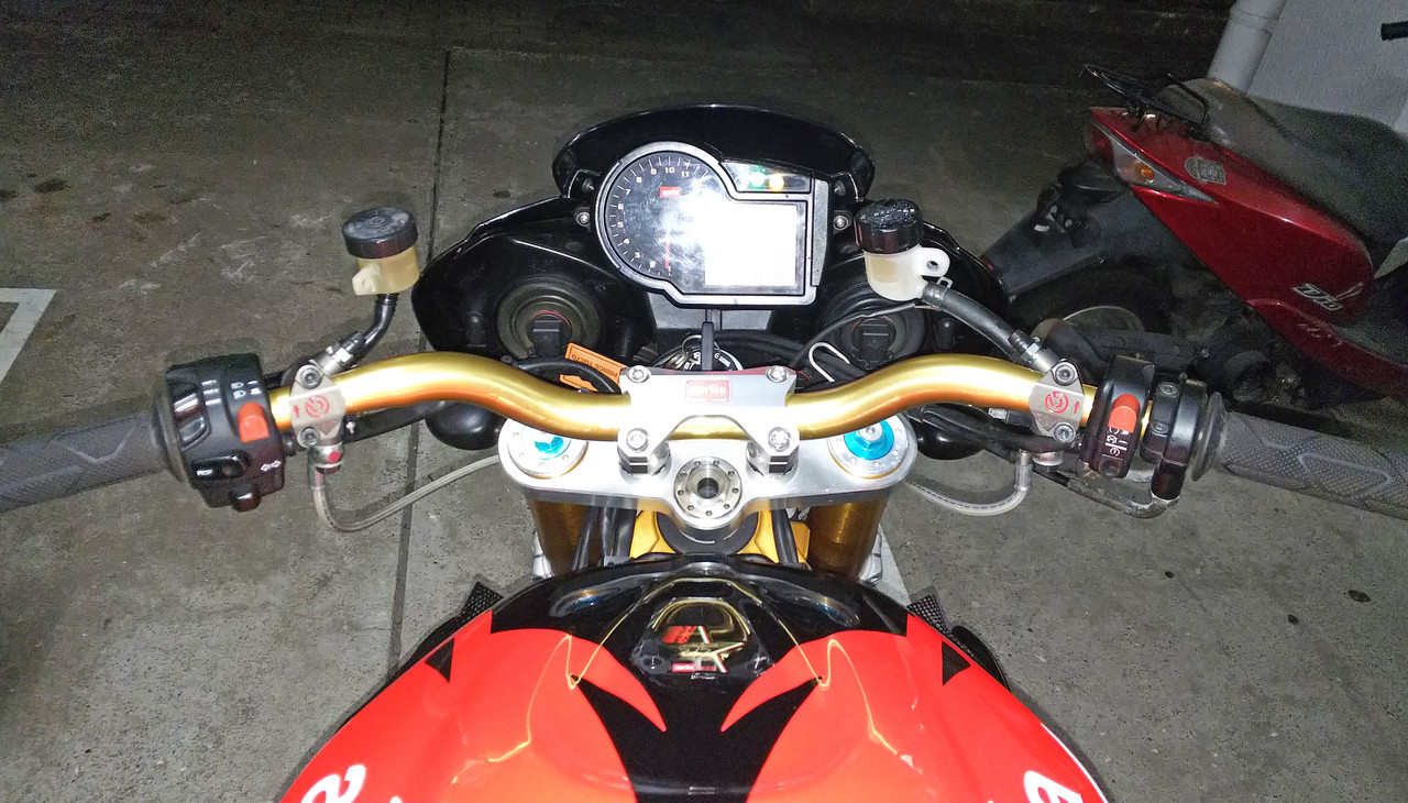 トゥオーノのバーハンドルはテーパータイプで、買ったミラーマウントは狭過ぎて着きませんでした (^o^ゞ