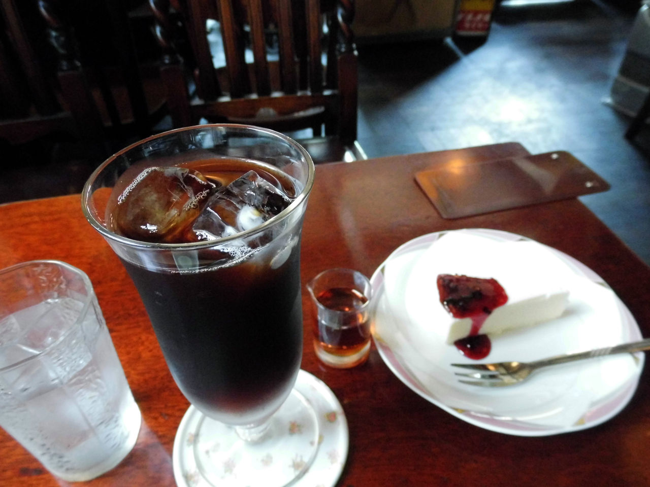 アイスコーヒーとレアチーズケーキを頼みました。薄暗い店内で寛いでいると子供の頃を思い出しました ♪