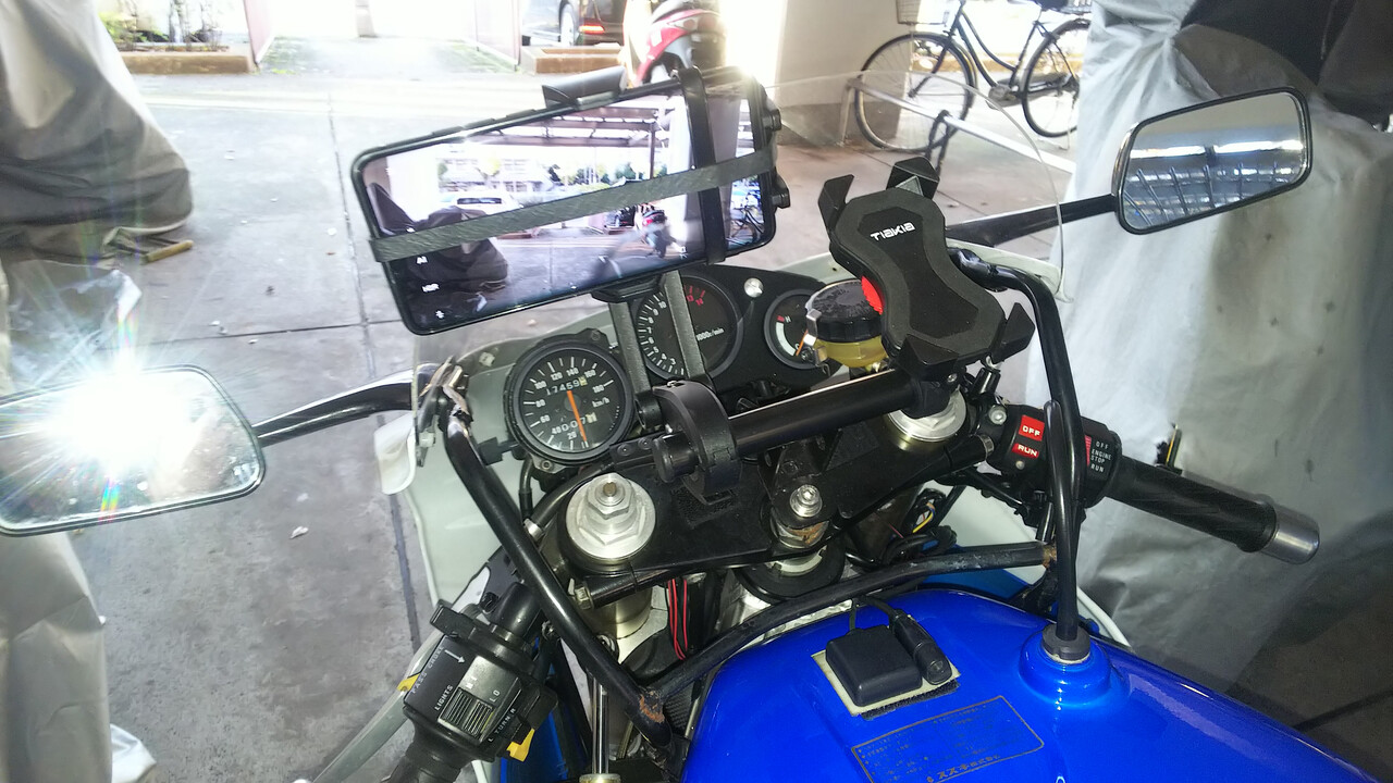スマホの角度を合わせるとこんなに首が長くなって、モーメントと言うか路面からの衝撃に首振りが激しそうです! いずれ自作で鉄板に替えて首の振らない様に変更する積もりです(^▽^;)