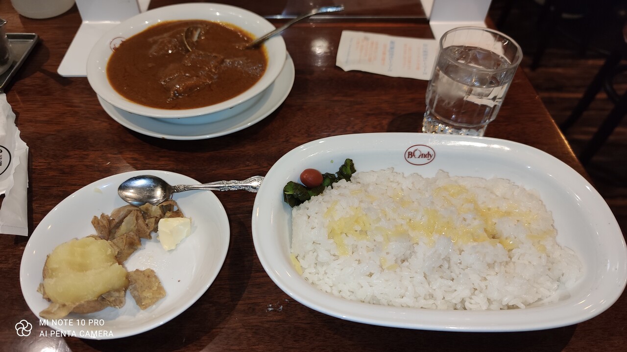 ビーフカレー中辛大盛り バター&ポテト付き。