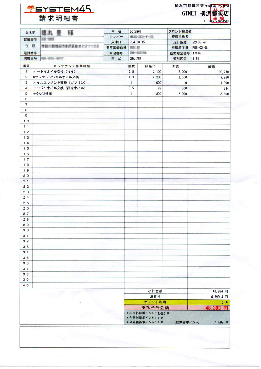 今回はオイルと言ってもエンジンオイル、エレメントだけじゃなく、22,000kmを超えたのでオートマオイル(トルコンオイル)デフオイル、あとエアコンのガスも入れて貰いました。