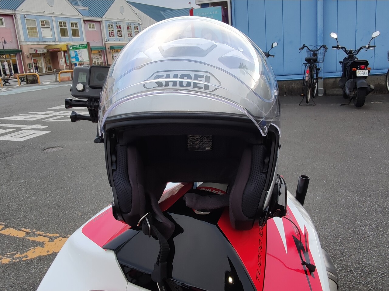 メットはSHOEI のJ クルーズⅡ。ピン・シールドで曇り無し♪右にGopro 、左にB+com で j-waveをラジコ・プレミアムで聴いてます。