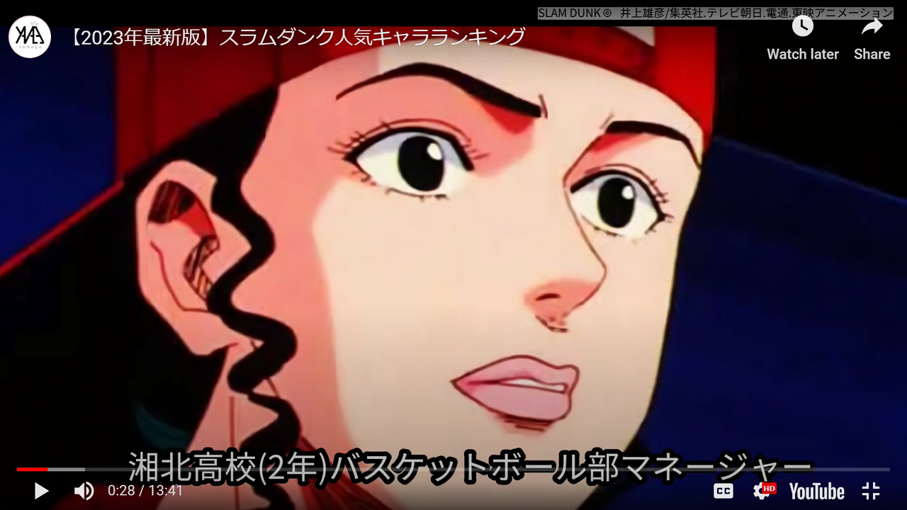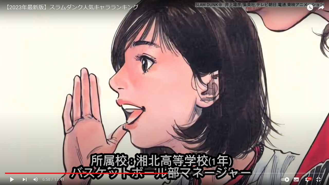 彩子は湘北高校2年生で、バスケ部のマネージャーとして物語では活躍をします。誰に対しても、強気な性格と態度で接することでマネージャーとしての役割を果たしています。主人公の桜木花道に対してバスケの基礎であるドリブルやパスを教え、湘北高校のエースの流川とは同じ中学出身です。また、宮城リョータの想い人でもあります。