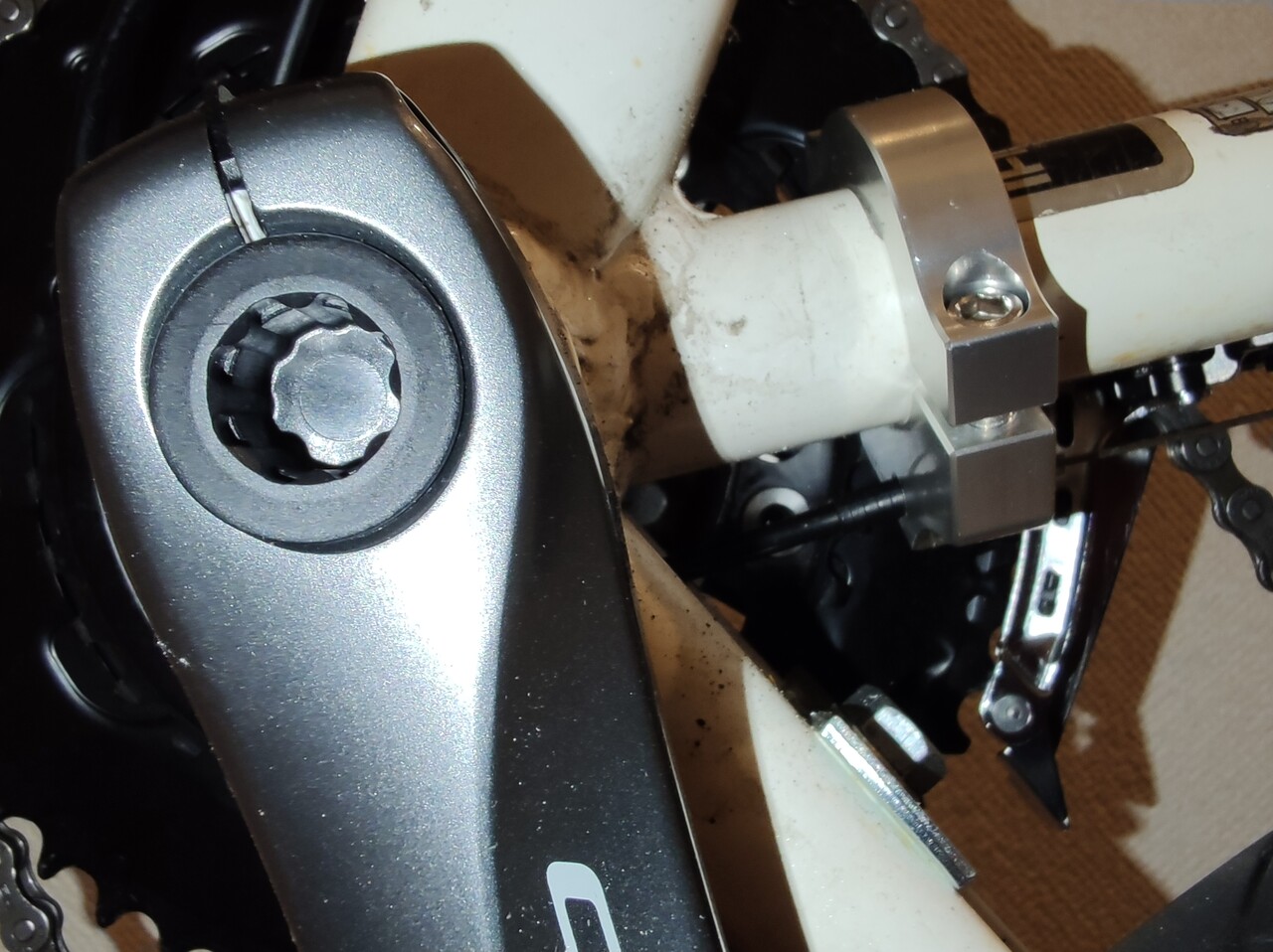 プレシジョンは元々7速なのでフロントディレイラーは着きません。 ここを強引に14速化に持って行きます!