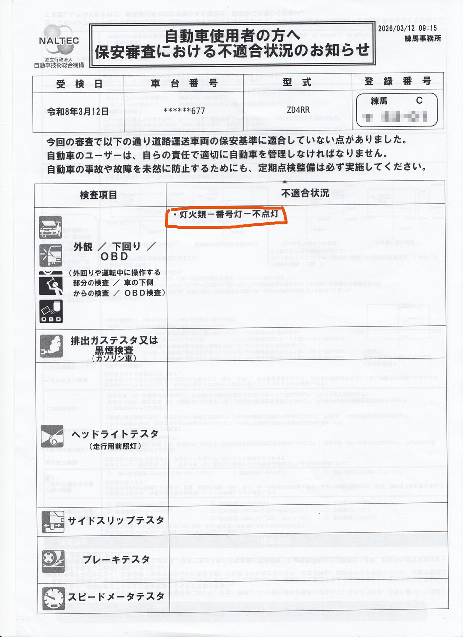 ナンバー灯の確認は見落としやすいので、ユーザー車検用にチェックシートに記入しましょう❗