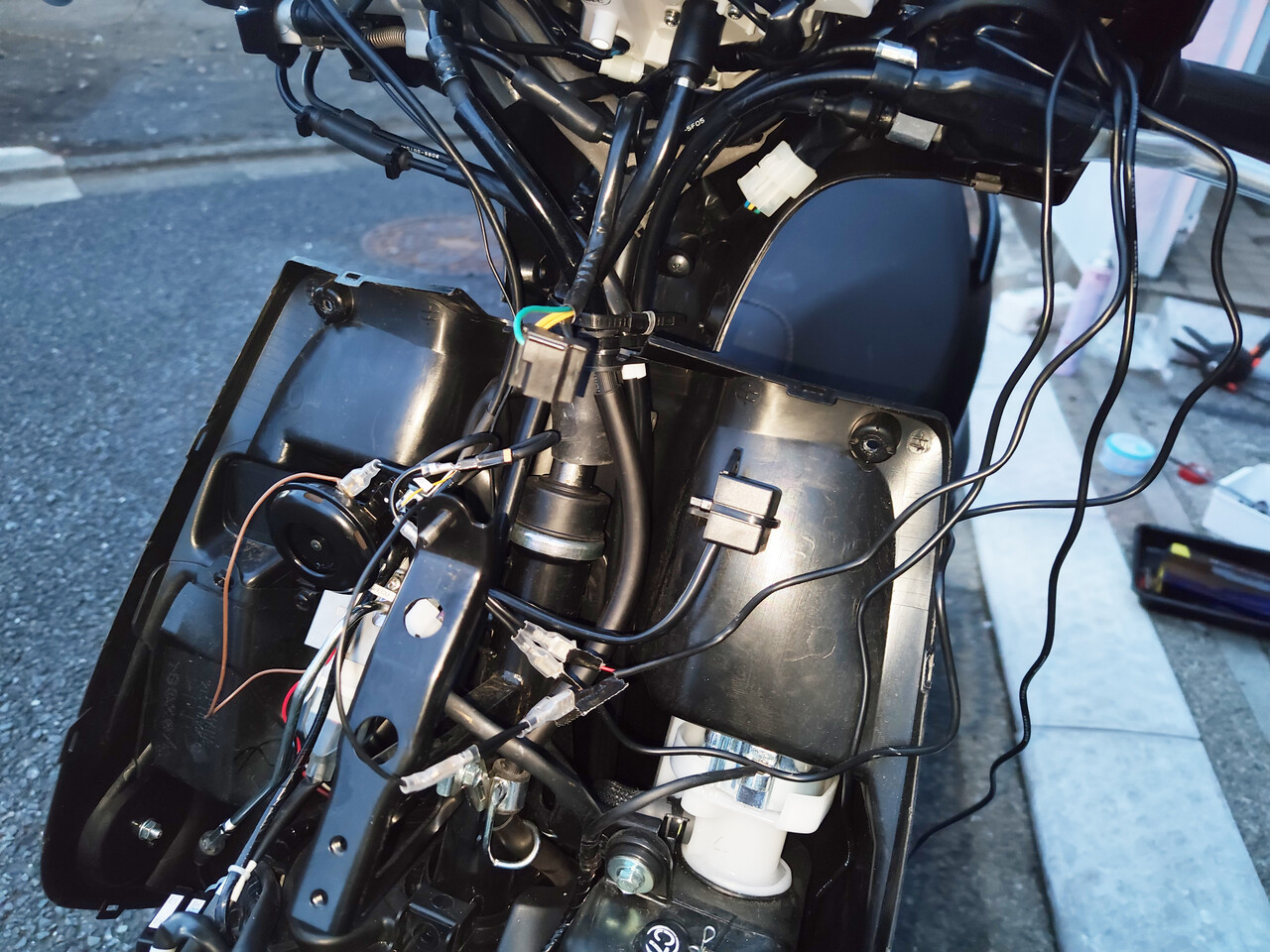 油温計ヘッド温度計の電源やセンサーのコードをハンドルカバーのミラーの穴からカウル内に通します。