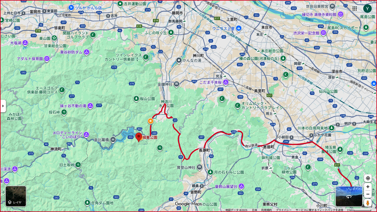 行きは関越で花園ICまで行きR140 R462 で城峯公園へ。