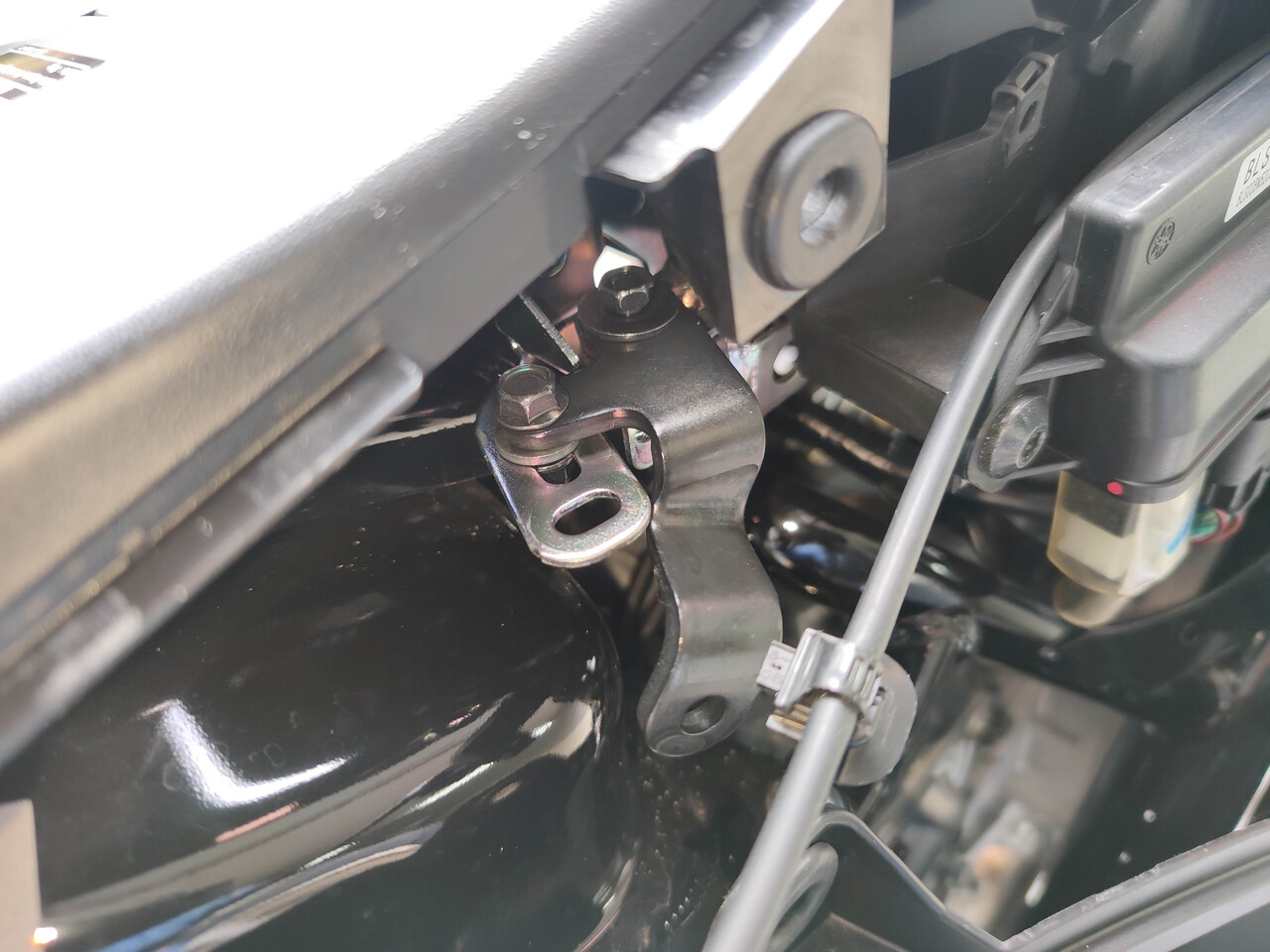 後ろ側のブラケットは付属ボルトで(ブラケットが結構分厚いので元のボルトじゃ寸法足らずです。) タンデムステップに共締めです。