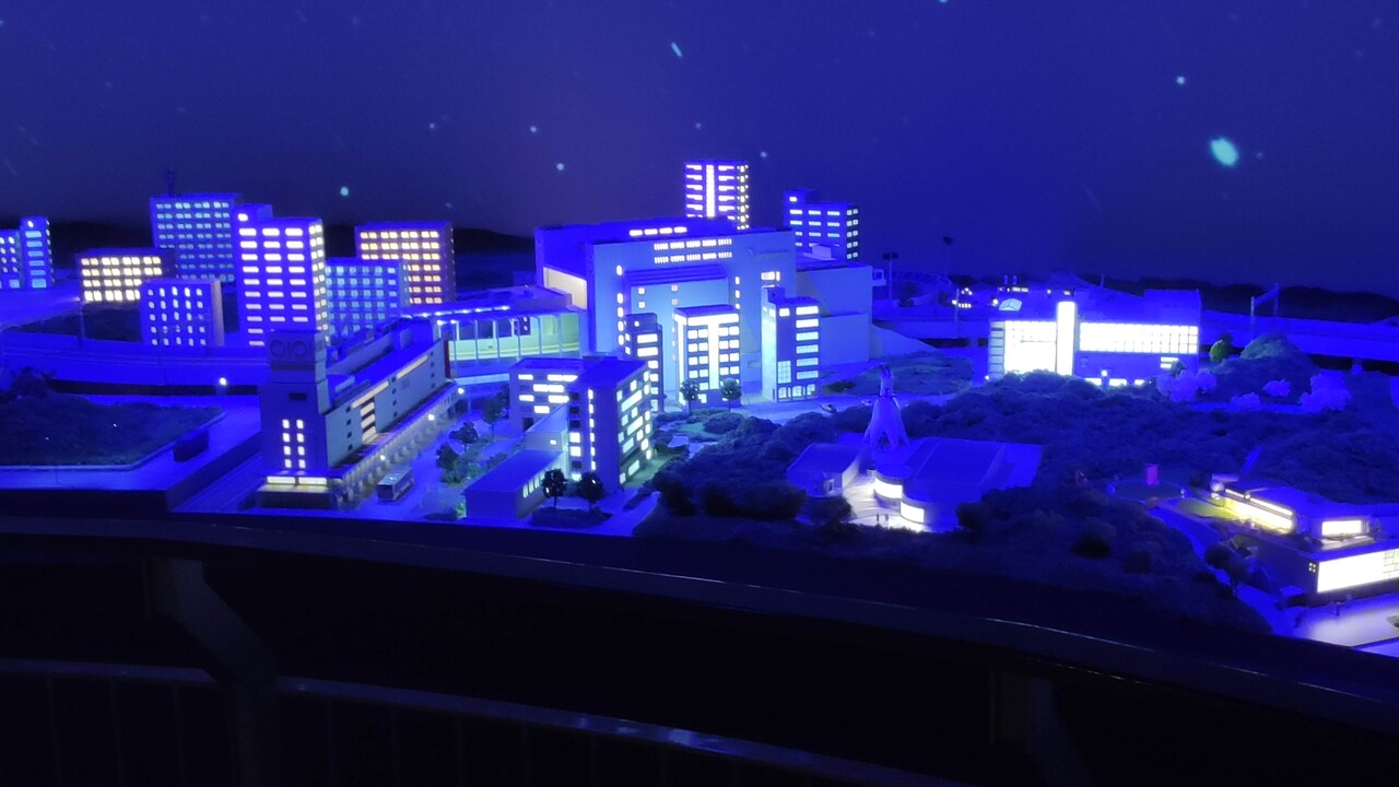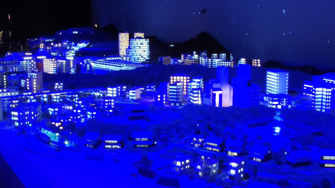 初めは夜の設定で建物は照明が灯り、見事に夜を演出してる👍