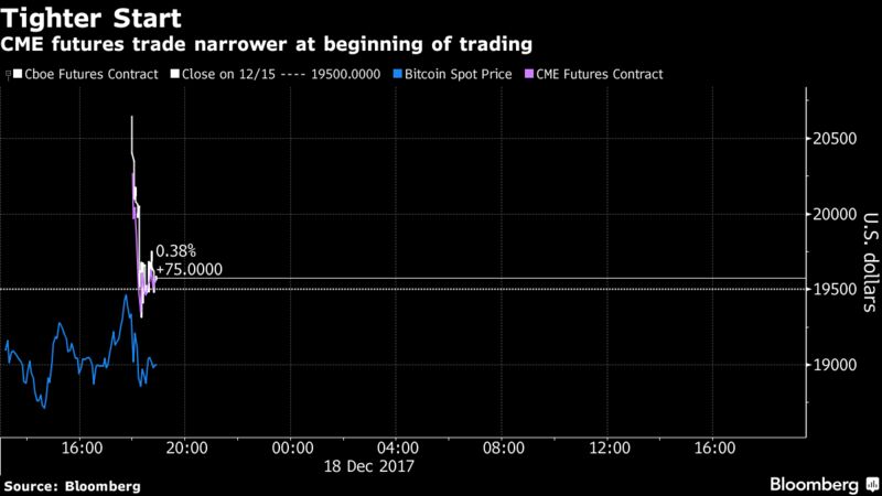1週間前にCBOEグローバル・マーケッツでビットコイン先物が上場したのに続き、シカゴのライバル、CMEグループでも17日夜、同様の先物の取引が始まった。CMEはCBOEに比べて先物市場ではるかに大きなプレーヤーであるため、同取引所に上場したビットコイン先物はより大きな注目を集めそうだとトレーダーの多くは予想している。