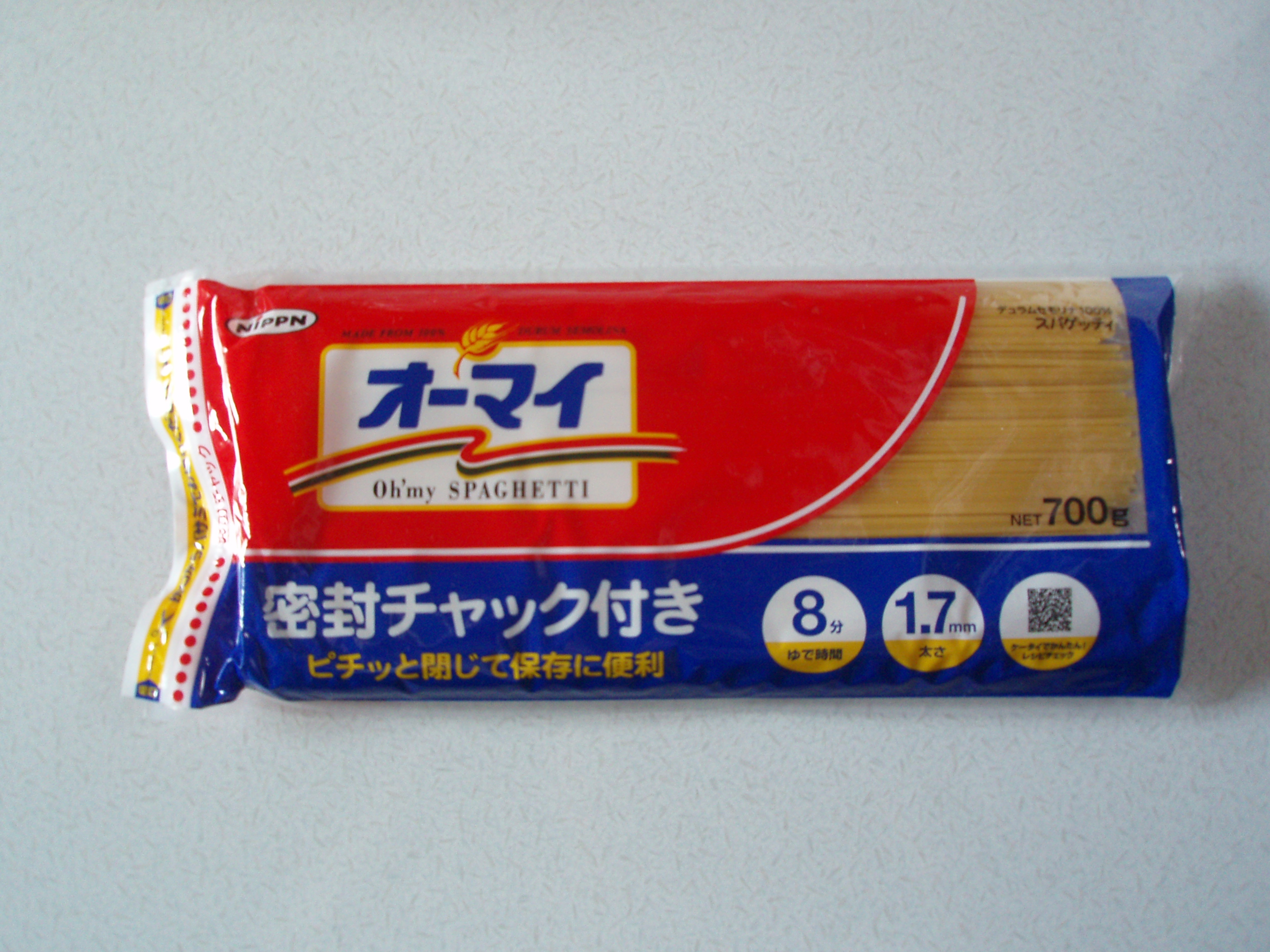日本製粉 (オーマイ・スパゲティ 密封チャック付 700g 1.7mm)開封後のスパゲティは、いつも2リットルのミネラルウォーターの空きペットボトルに入れかえていますが、場所をとります。このスパゲティは、密封チャックが付いているので、入れかえをせず、そのまま保存できます。切り口が両側にあるので、切り口を探す手間もいりません。茹で時間8分で、おいしいスパゲティができました。スパゲティは、昼食によく食べるので、これからも買って食べたいと思います