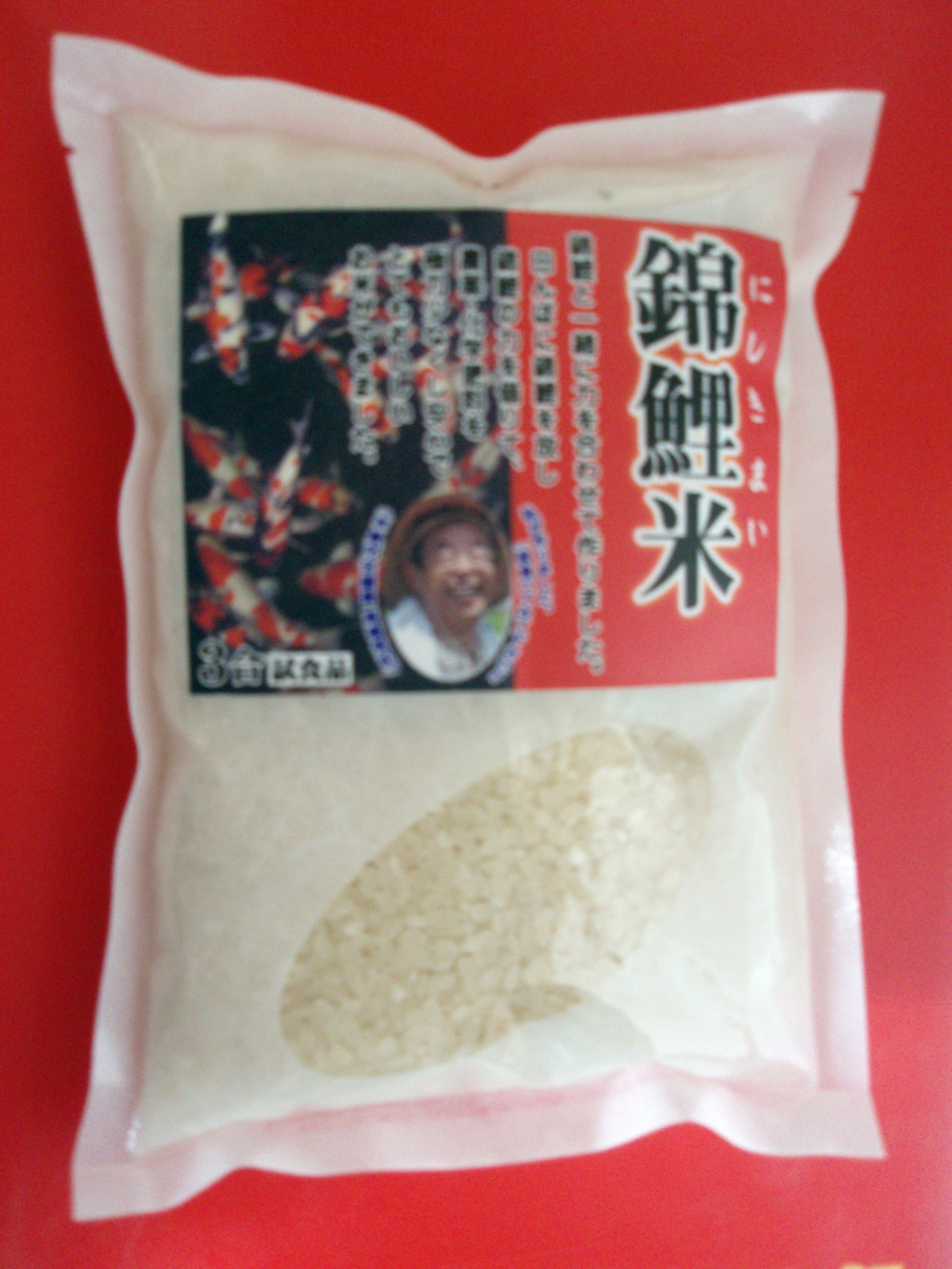 鯉道楽 (錦鯉米)田んぼに錦鯉を放し、錦鯉の力を借りて、農薬・化学調味料を極力少なくして作ったという、錦鯉米(にしきまい)は、甘味があって、お米の一粒一粒がしっかりとした、おいしいコシヒカリです。 3合のお米の半分は、白ご飯で、残り半分は卵かけご飯で頂きました。冷めてもおいしかったので、お弁当にもぴったりです。 農薬・化学肥料の使用が少ないというのも、とてもうれしいことです。 今まで見かけたことがないのですが、 売っているのを見かけたら、買いたいと思います。