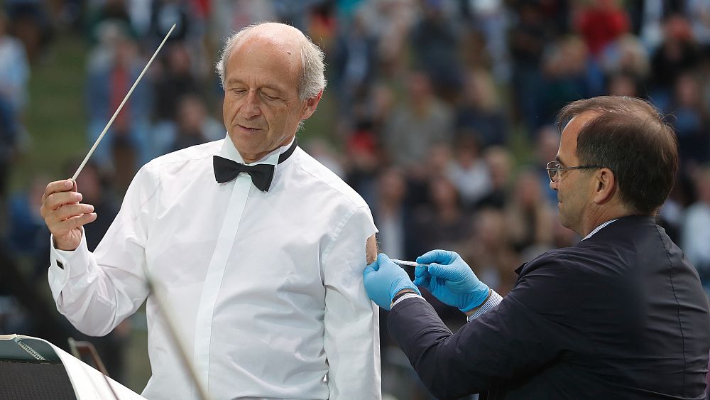 指揮者のFischer Ivánさんが、舞台上で演奏中、指揮をしながら3回目のワクチン接種をしたとの事。