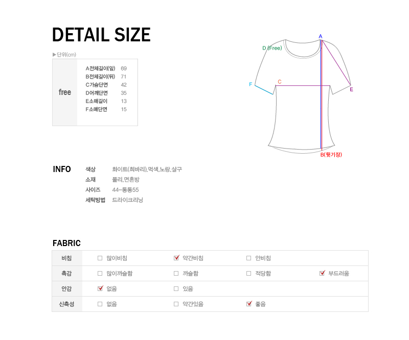 * モニターの環境によって実物と色が違って見える場合があります。 詳細サイズ サイズ 全長(前) 全長(後) 胸幅 肩幅 袖丈 袖幅 Free 69 71 42 35 13 15 単位: cm