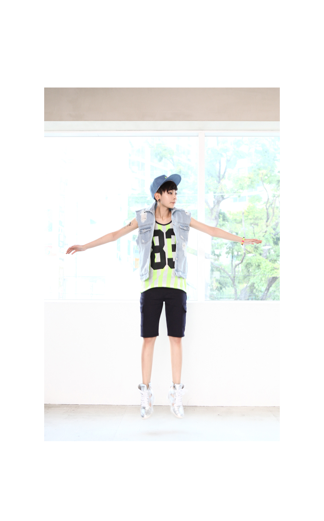 Tシャツは透けるほど薄い素材でゆったりシルエット、