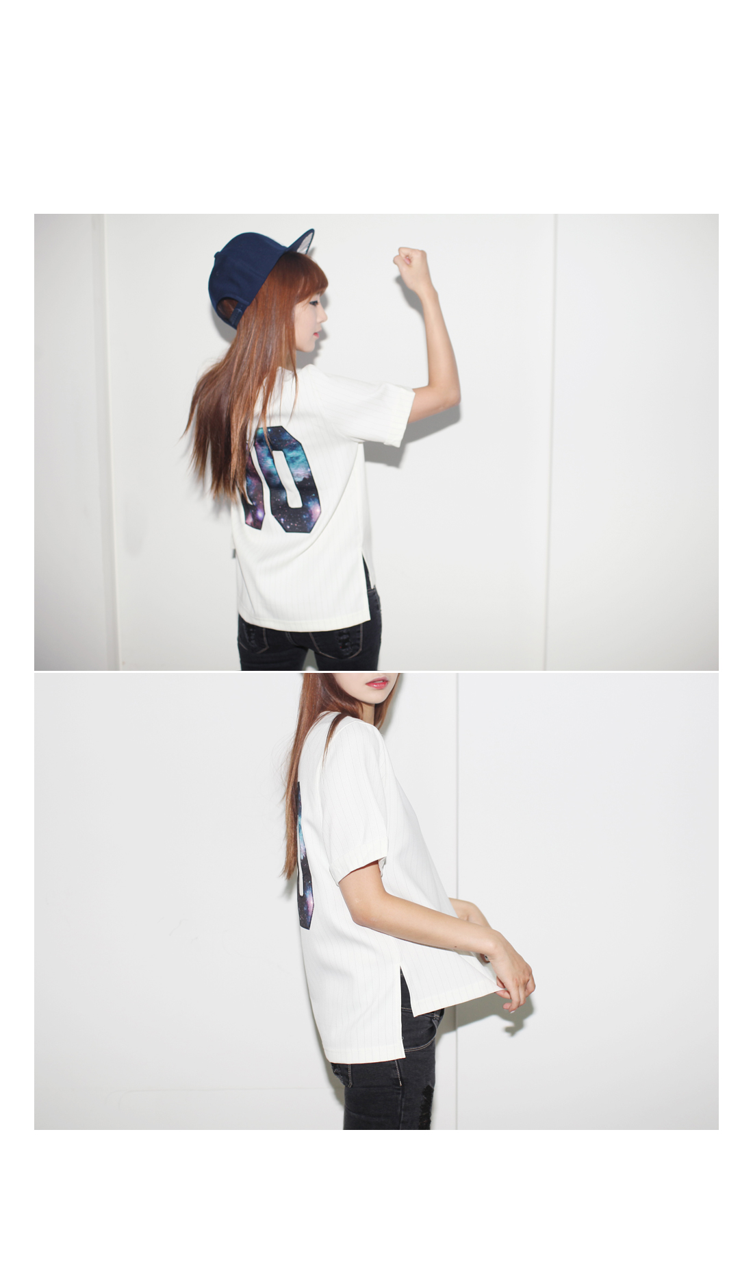 バックの大きな数字パッチやストライプ柄がスポーティな印象で、トレンドのストリートルックやL.A.シティガールスタイルにもピッタリのトップスです☆