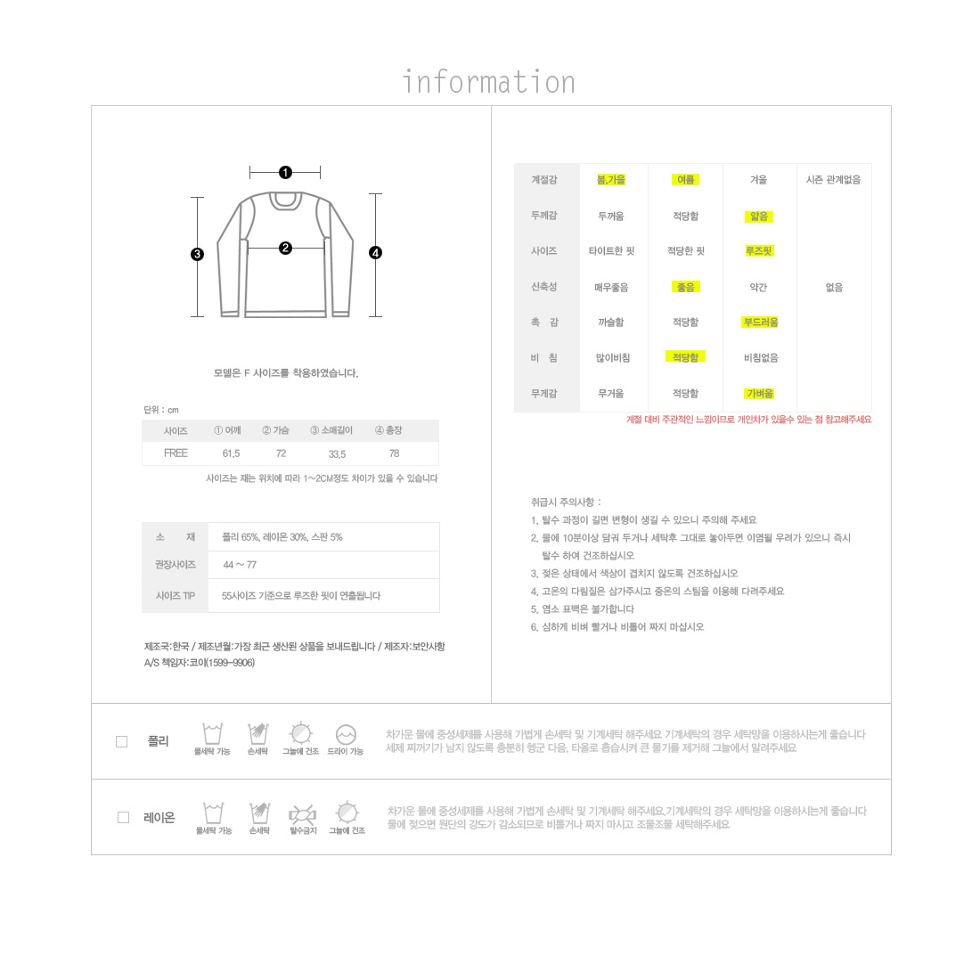 伸縮性が良くて気軽に着ていただけます。 素材ポリエステル65%、レーヨン30%、スパンデックス5%洗濯方法ポリエステル-水洗い/手洗い/陰干し/ドライクリーニング、、レーヨン-水洗い/手洗い/脱水禁止/陰干しモデル着用F詳細情報シーズン:春+秋+夏/厚み:薄い/シルエット:ルーズ/伸縮性:良し/手触り:なめらか/透け感:若干/重み:軽い製造情報製造国:韓国/製造者:保安事項/製造年月:最も最近生産された商品をお送りしております。備考* 測り方によって、1~2cm程の誤差が生じる可能性があります。