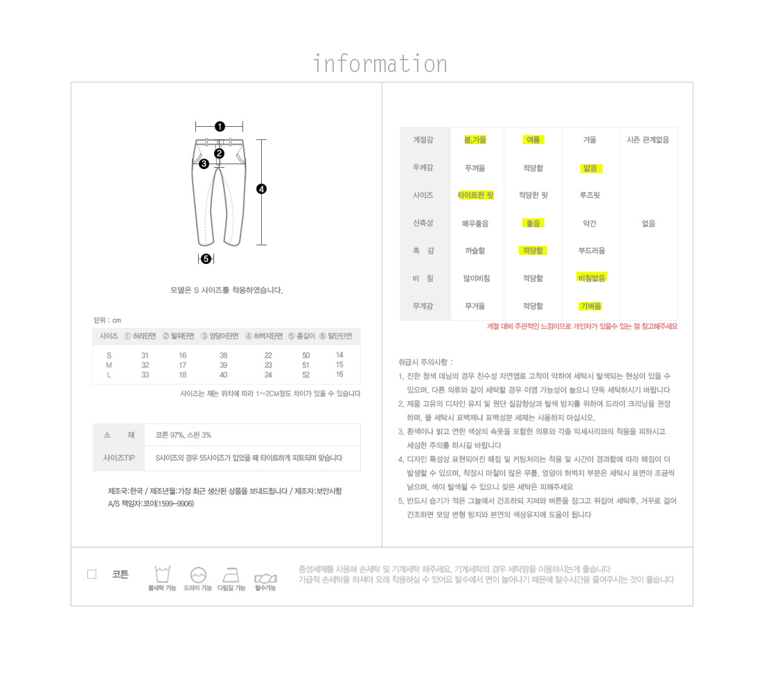 トーンダウンしたカラーは、多様なトップスと合わせやすくて便利♪素材コットン97%、スパンデックス3%洗濯方法水洗い/ドライクリーニング/アイロン掛け可能/脱水可能モデル着用S詳細情報シーズン:春+秋+夏/厚み:薄い/シルエット:タイト/伸縮性:良し/手触り:普通/透け感:無し/重み:軽い製造情報製造国:韓国/製造者:保安事項/製造年月:最も最近生産された商品をお送りしております。備考* 測り方によって、1~2cm程の誤差が生じる可能性があります。