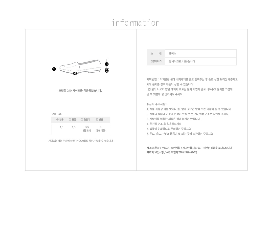 ベーシックなデザインなので、1足もっておくと重宝するアイテムです。素材キャンバスモデル着用240製造情報製造国:韓国/製造者:保安事項/製造年月:最も最近生産された商品をお送りしております。備考* 測り方によって、1~2cm程の誤差が生じる可能性があります。