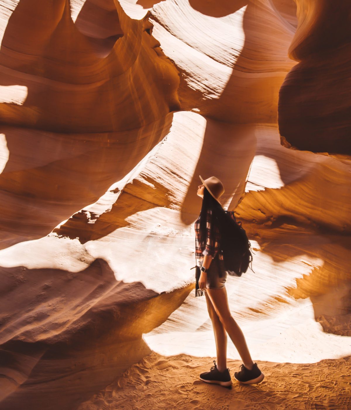 アンテロープキャニオンは赤みがかったベージュの砂岩が鉄砲水で削られてできた峡谷。