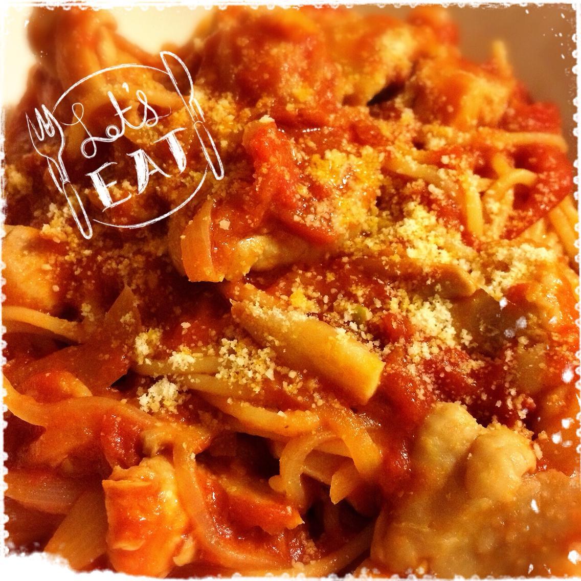 で、今日はおうちにあるもので、トマトパスタを作ってもらいました、おほほ。