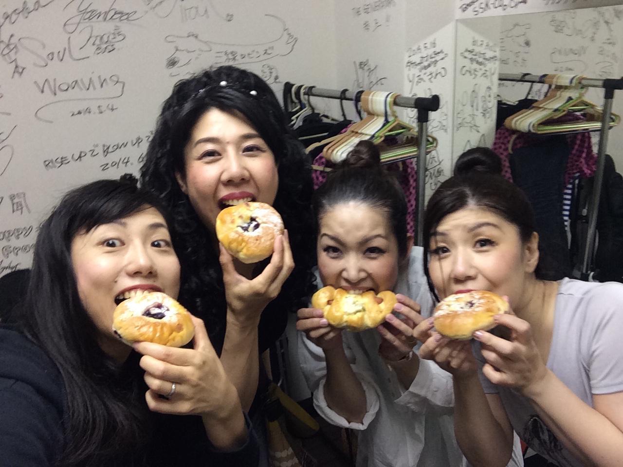 おまけにいつもライブのたびに差し入れを手作りしてきてくださるえいこさんのパンを出演後に控え室で食べるボーカルチームの図