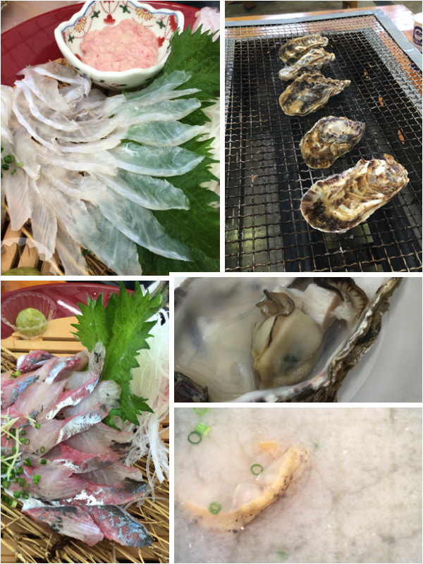 豊漁丸さんで牡蠣、かわはぎ刺、あじ刺とほたての味噌汁。最後にししゃももいただきました。牡蠣は小ぶりでしたがおいしかったですし、こちらのお刺身は超美味です♪