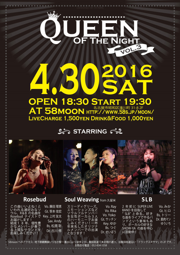 そしてRosebudさんにはコーラスにあやめさんとまいちゃんが加わって、Queen of the Nightにふさわしく女性ボーカルだらけです!ぜひぜひ58moonに会いにきてください!お待ちしてまーす♪