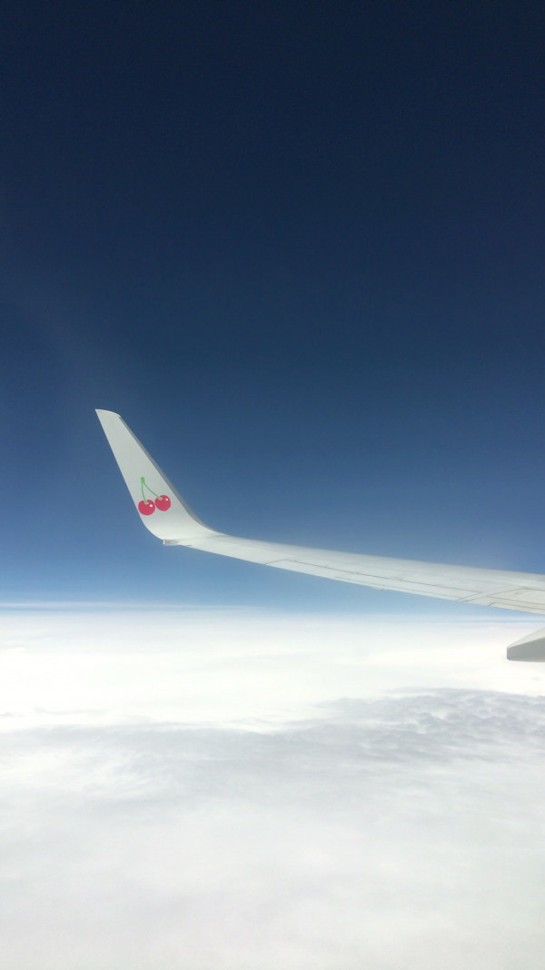 行きの飛行機は雲が多くて揺れたけど、雲を抜けるとキレイな青空。