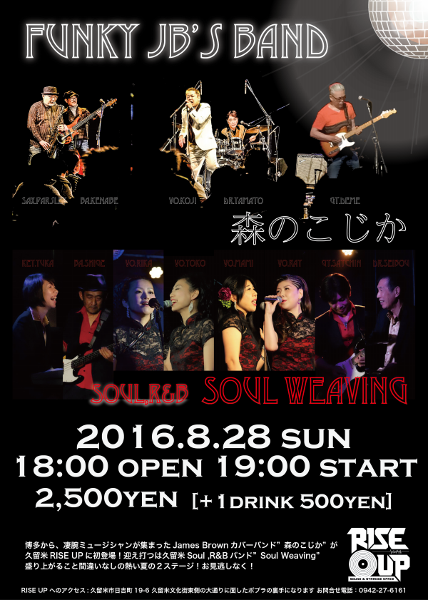 ひさしぶりのSoul Weavingライブは、来週28日日曜日、久留米RISE UPさんです♪mamiさんは半年ぶりのSoul Weavingのボーカルとして登場されますので、お誕生日お祝いの気持ち(物でも可、笑)を抱えつつ、ぜひ足をお運びくださいませ!博多からJames Brownのカバーバンド"森のこじか”さんがお越しになり、2バンドをたっぷりお楽しみいただけますよ。