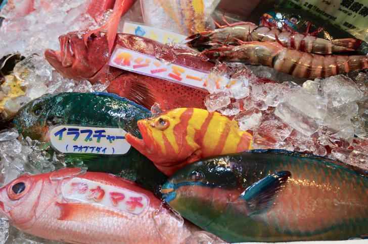 沖縄ならではのカラフルな魚や珍しい地元野菜もずらりと並んでます!!