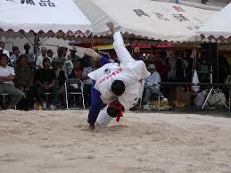 背中と両肩を地面につけなくてならない沖縄相撲は
