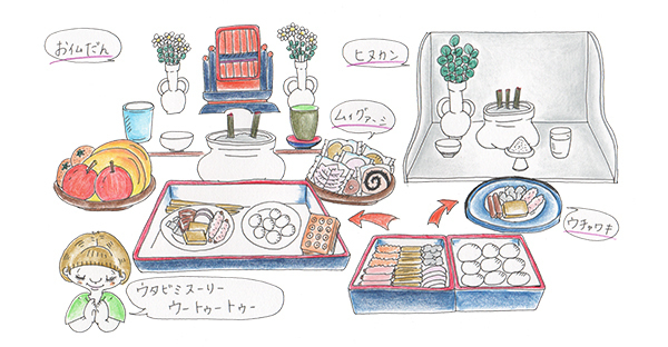 彼岸の中日をはさんで前後三日の七日以内に仏壇やヒヌカンにご馳走をお供えし、